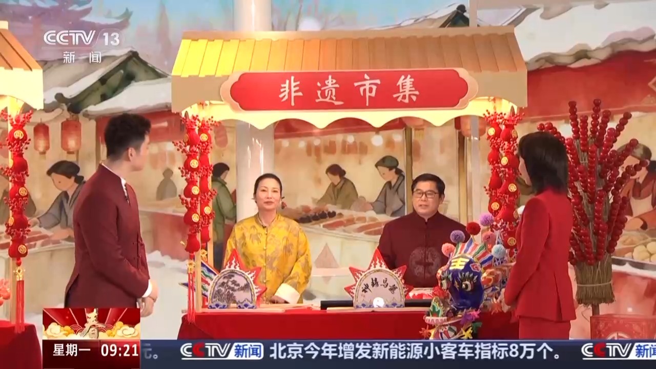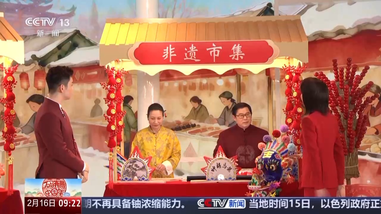安琪:我和哈乐是今天的“非遗体验官”,带观众朋友们一起走进新闻频道演播室打造的“非遗市集”逛一逛。