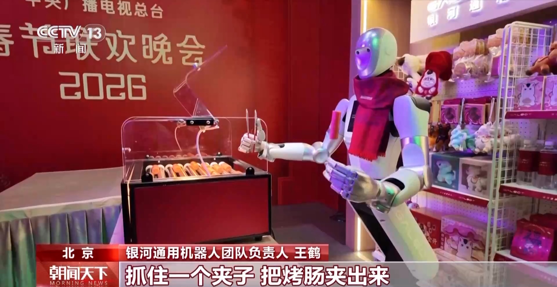 银河通用机器人团队负责人 王鹤:从长远来看,五指灵巧手它有非常好的适应性、通用性,我们今天做的这些事情,未来都可能是真实商用方案的一部分。这个烤肠,人形机器人会先用手抓住一个夹子,把烤肠夹出来,再拿一根签子串,烤肠还在不停地滚动,这次为了春晚加急训练了这个技能,目前在春晚上已经可以顺利展示,后面我们也要把它布局到全国的太空舱里去。