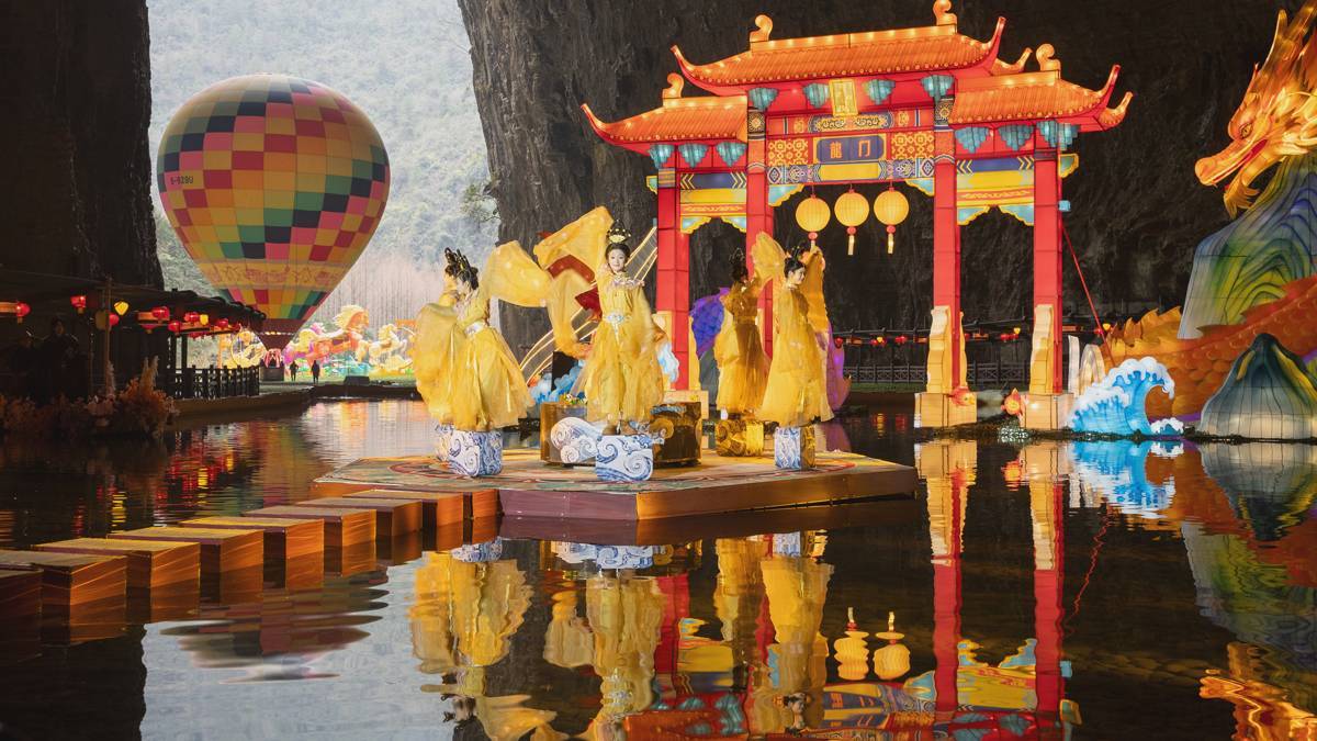 利川腾龙洞依托溶洞独特的自然禀赋,打造了一场“洞藏万象·土家迎新”新春奇幻灯会。22组融合土家文化与自贡彩灯技艺的灯组在溶洞中点亮,配合NPC(非玩家角色)互动、投壶猜瓶等传统游戏,让游客从“看灯人”变成“入景人”。