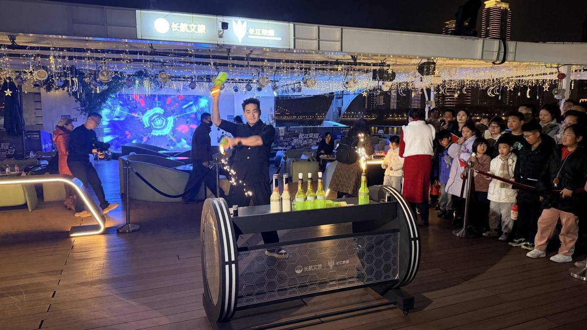 “没想到在长江上也能逛非遗庙会,伴着两岸灯火,这个年过得太特别了!”2月15日晚,长沙游客黄坤带着家人登上焕新归来的“长江荣耀”游轮,刚踏入船舱,就被满眼的中国红吸引——大红对联、喜庆福字,朱红拱门搭配大红灯笼,身着大红色汉服的工作人员微笑相迎,浓浓的年味扑面而来。