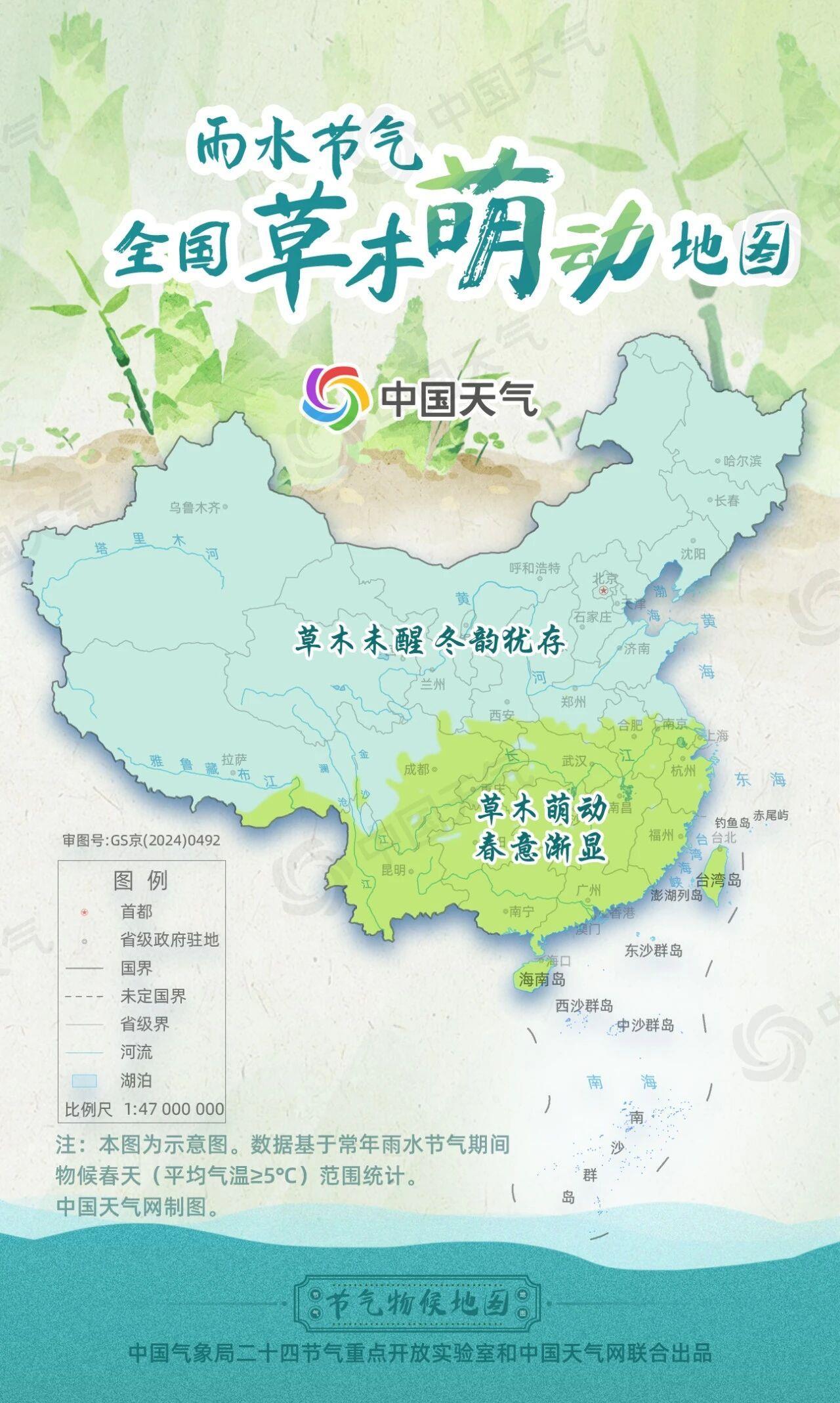 从全国草木萌动地图来看,常年雨水节气期间南方大部草色渐显,嫩芽纷纷吐绿,一幅生机勃勃的早春画卷在眼前徐徐展开。当南方春意萌发之时,北方大部仍处于冬季,气候较干燥,草木依旧沉眠,静待新生。
