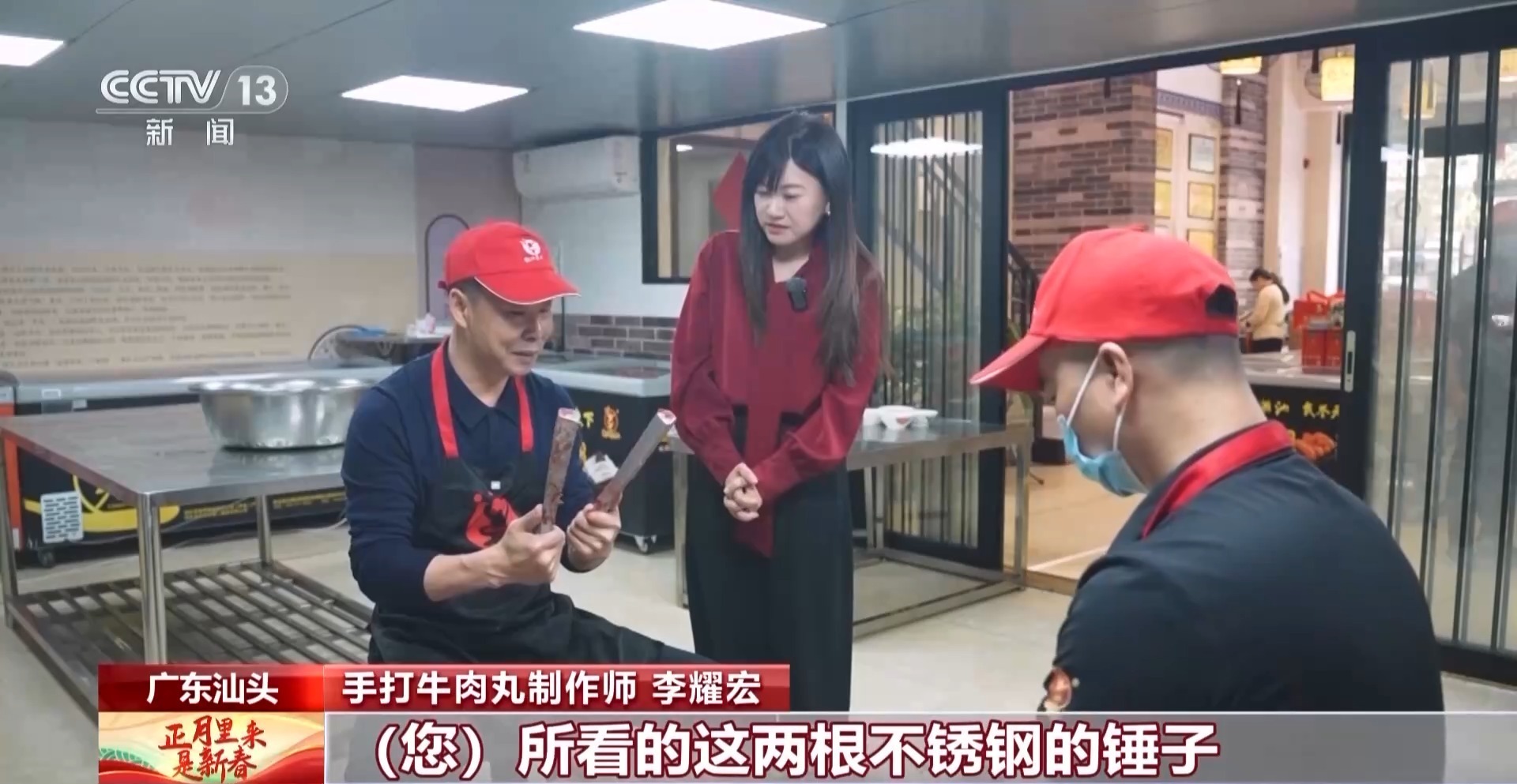 手打牛肉丸制作师 李耀宏:这两根不锈钢锤子看起来可能个头不大,但两根就有七斤重。我们手捶牛肉最起码要捶打六千到八千次,捶打的节奏力道如马奔、节奏如马蹄。