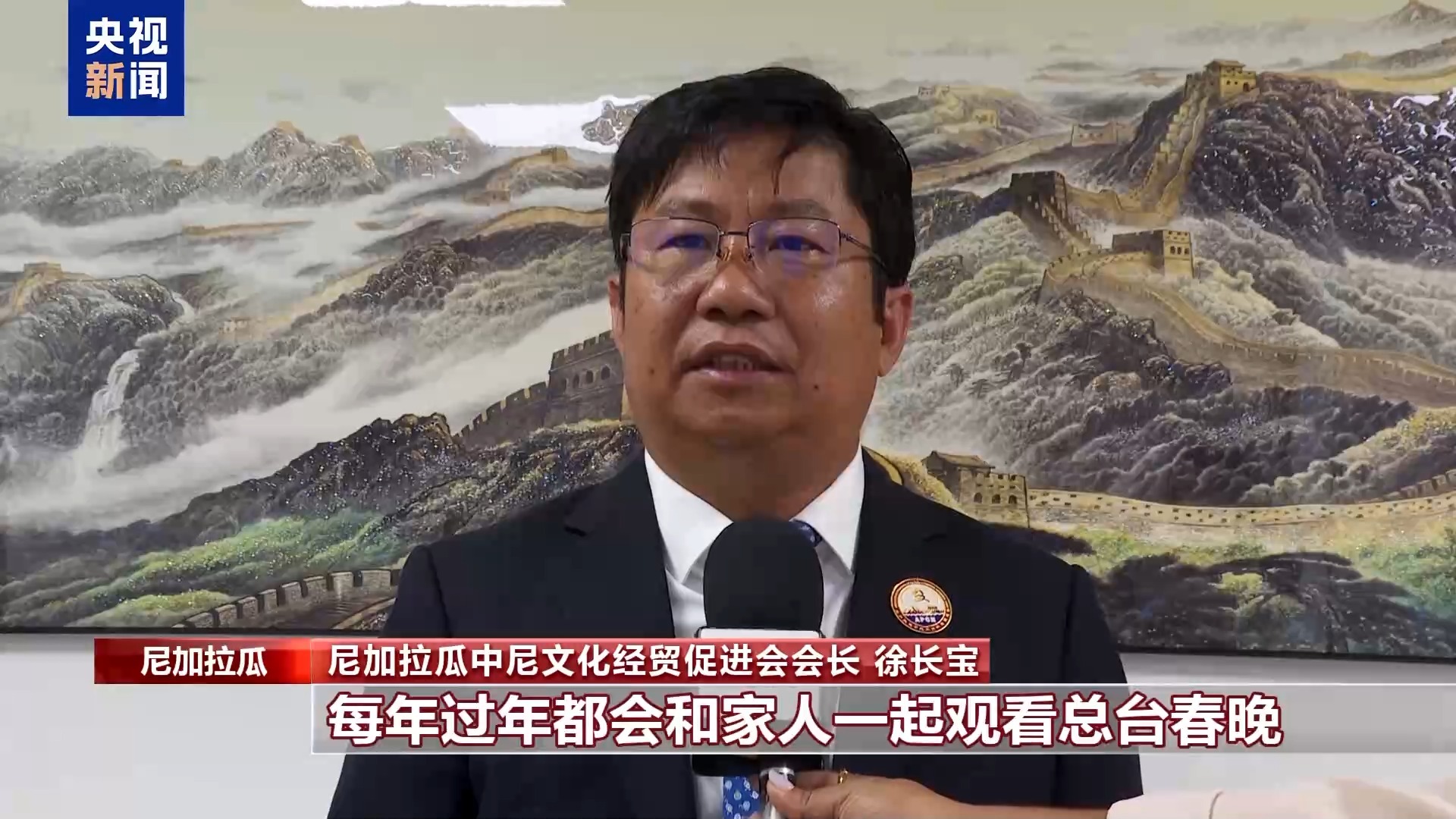 尼加拉瓜中尼文化经贸促进会会长 徐长宝:我在尼加拉瓜已经生活了12年了,每年过年都会和家人一起观看总台春晚。2026年总台马年春晚成为连接中国与拉美,连接祖国与海外华侨的重要文化桥梁。让世界通过春晚,更好地读懂中国,我代表尼加拉瓜中尼文化经贸促进会,祝愿祖国繁荣昌盛,祝愿祖国人民幸福安康。