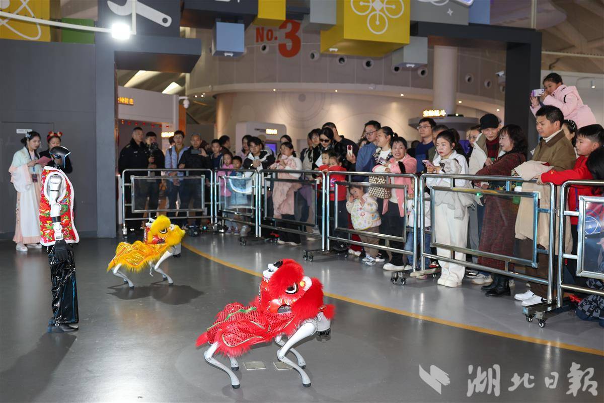 2月19日,在襄阳市科技馆,游客观看机器人舞狮表演。