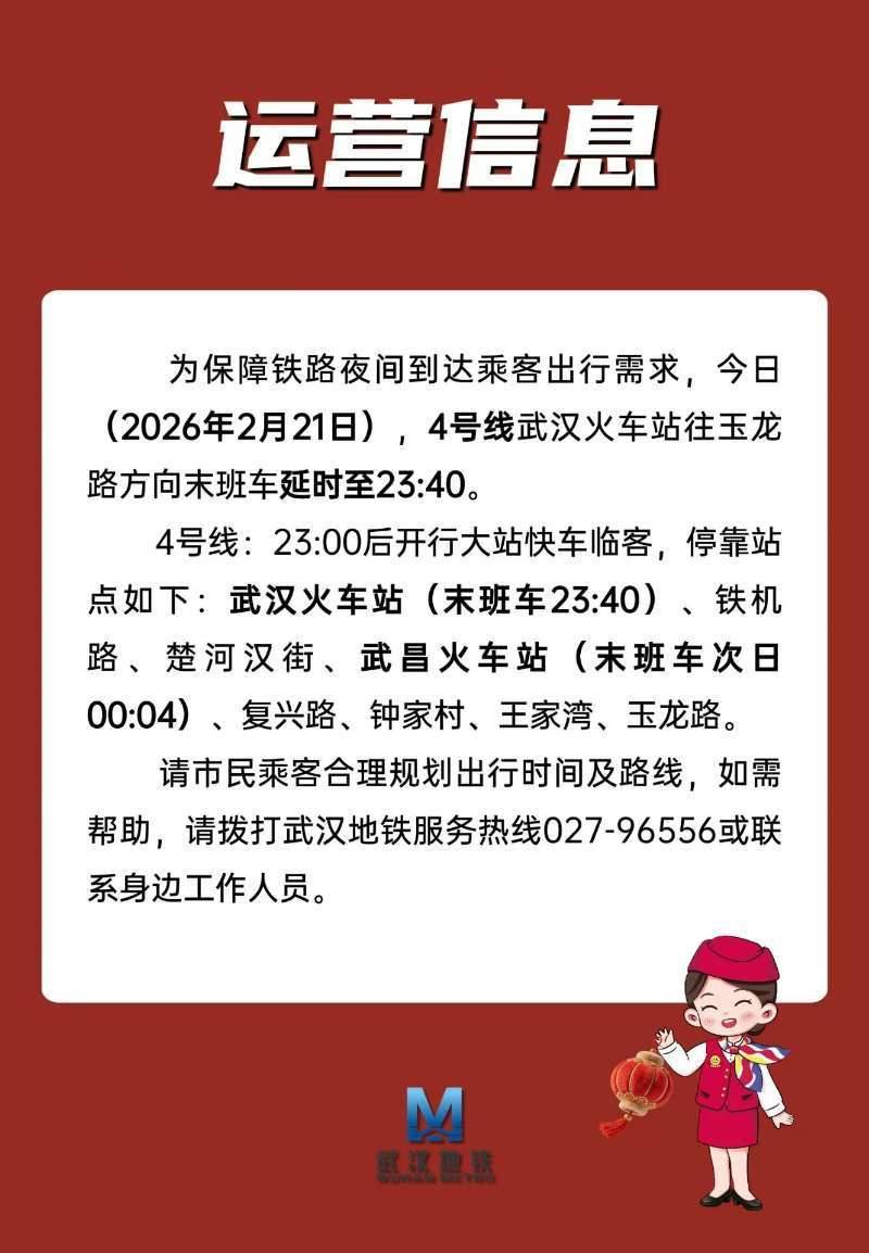 湖北日报讯(记者黄洁如、通讯员李丹、产启斗)为保障铁路夜间到达乘客出行需求,今日(2月21日),4号线武汉火车站往玉龙路方向末班车延时至23:40。