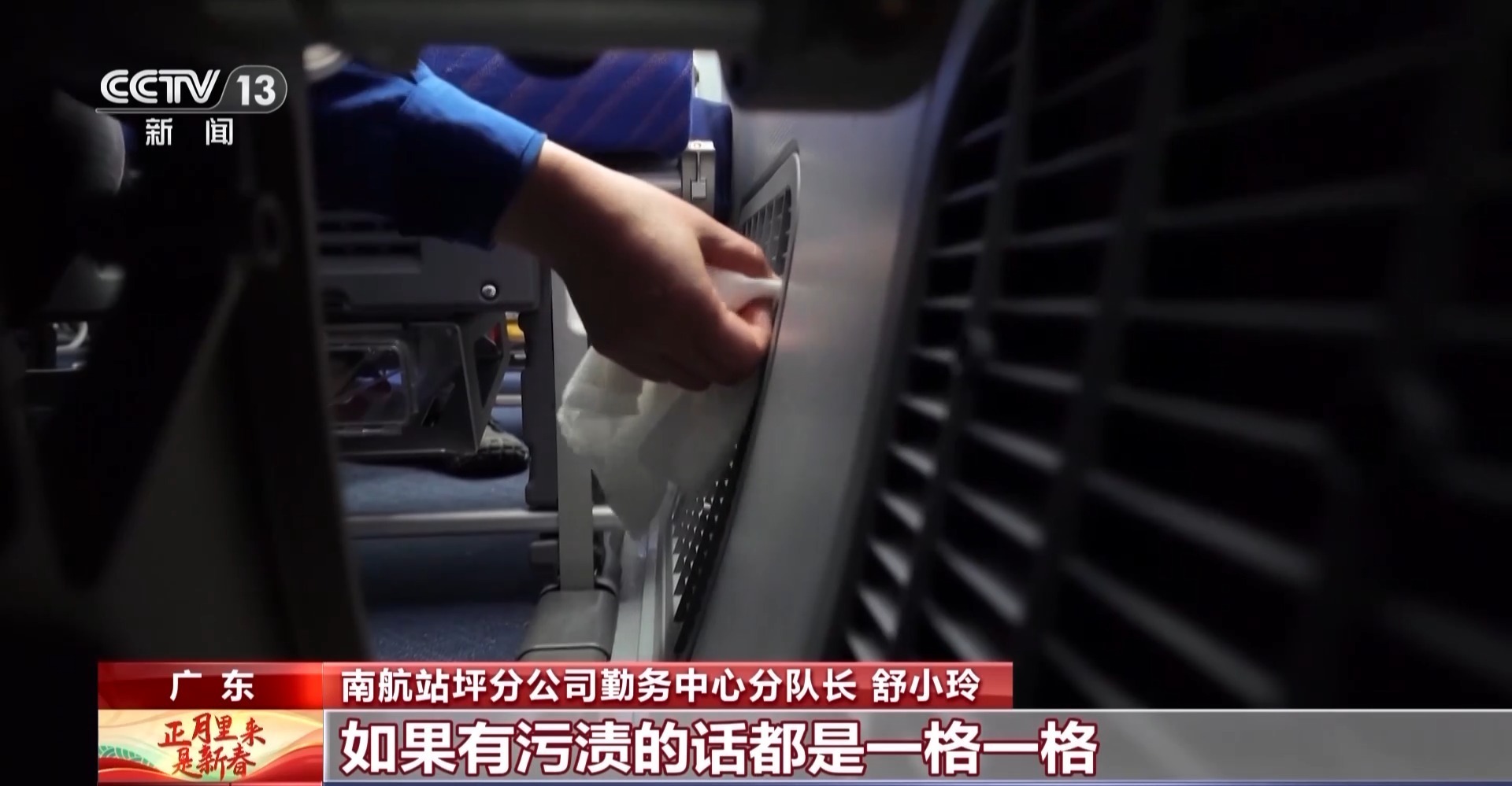 南航站坪分公司勤务中心分队长 舒小玲:排气孔我们都是要用手,如果有污渍都是一格一格拿着毛巾擦拭干净,这项工作是非常耗时的。因为我们要保障这么多座位,一个座位弯一次腰的话,一个人也要几十次。蹲在这么狭小空间,对我们来讲其实也是一种考验。