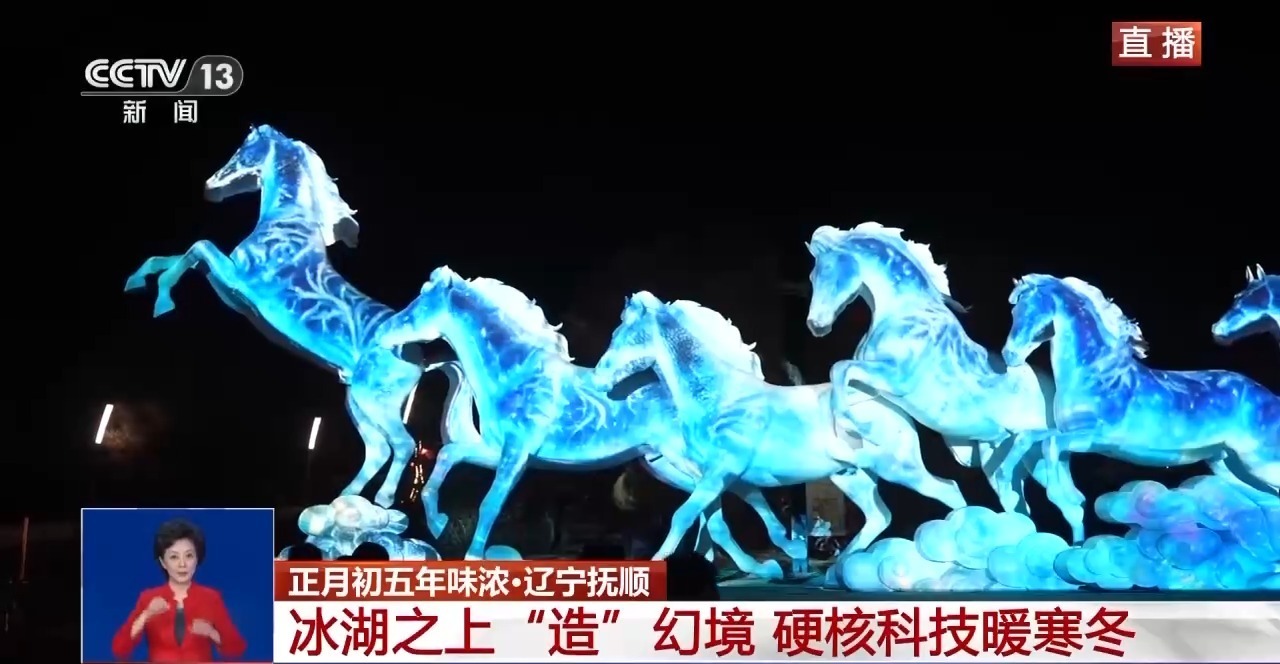 今年抚顺月牙岛新春灯会最大的亮点是“科技感”。 一组“骏马奔腾”的灯组由3D打印完成。白天,它们是栩栩如生的雕塑;到了夜晚,精准的互动投影技术将这群骏马“唤醒”。马匹时而如冰雕玉琢般晶莹,时而身披中国红的盛装,稍微一眨眼,马背上又幻化出朵朵春花,仿佛在花海中尽情地驰骋。