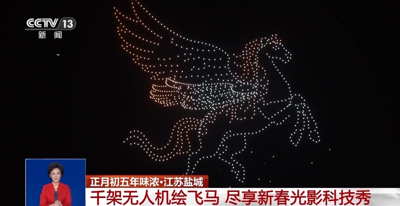 盐城大纵湖1000多架无人机携五彩光芒缓缓升空。夜幕如幕布,无人机群化作流动的光影画笔,勾勒出“飞马踏云”图景。