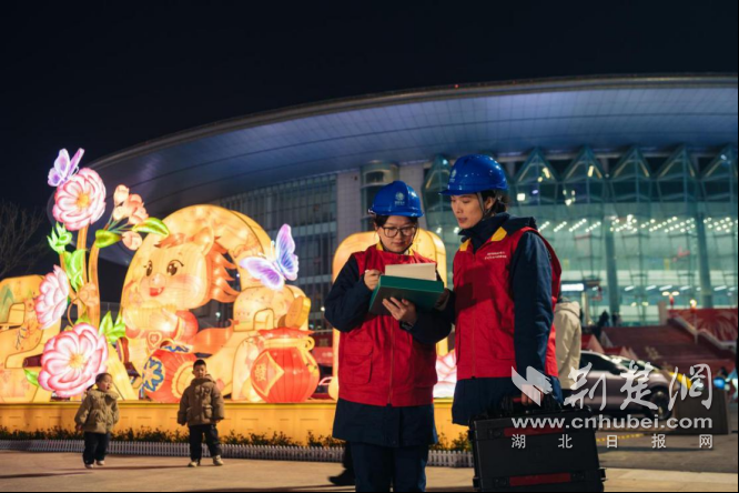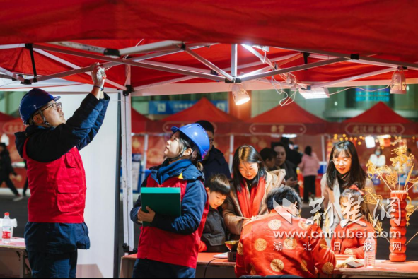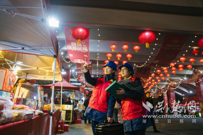 就在这热闹背后几步远的地方,几个身着深蓝色工装的身影正穿过人流,走向广场东侧的配电箱。他们的肩上挎着工具包,手里握着红外测温仪——他们是国网武汉供电公司的运维人员,也是这场年货节幕后的“电力守护者”。