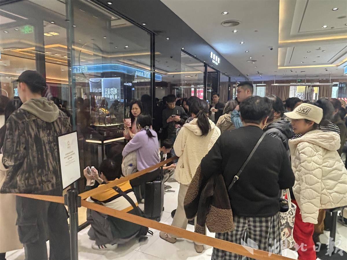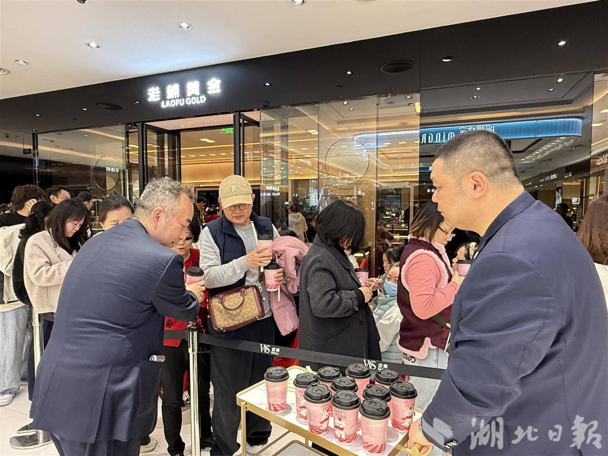 当日中午12时,湖北日报全媒记者抵达现场时,武商MALL·世贸正为排队顾客发放奶茶、春卷、热干面等汉味小吃,等候区香气四溢,顾客边吃边聊,热闹而有序。蜿蜒的队伍从专柜门口延伸至商场外,粗略估算现场超百人,不少人带着小板凳早早占位,其中拖着行李箱的外地顾客格外显眼。