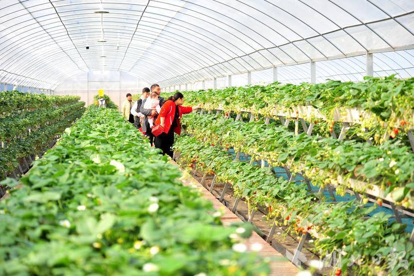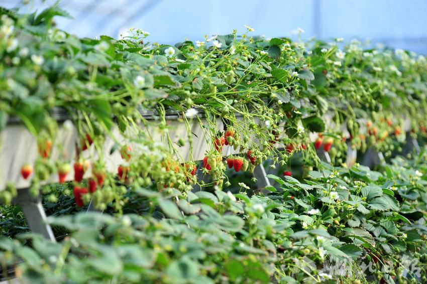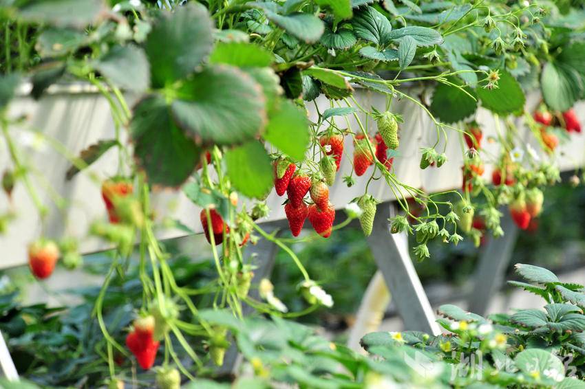 与传统种植方式不同,基地采取立体种植技术,草莓植株被精心安置在不同高度的栽培架上,形成一道道色泽诱人的“草莓墙”,一幅科技赋能农业的鲜活画卷在温室大棚中铺展开来。