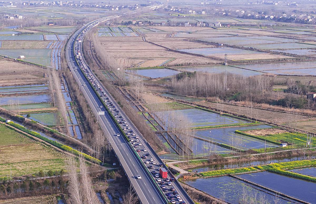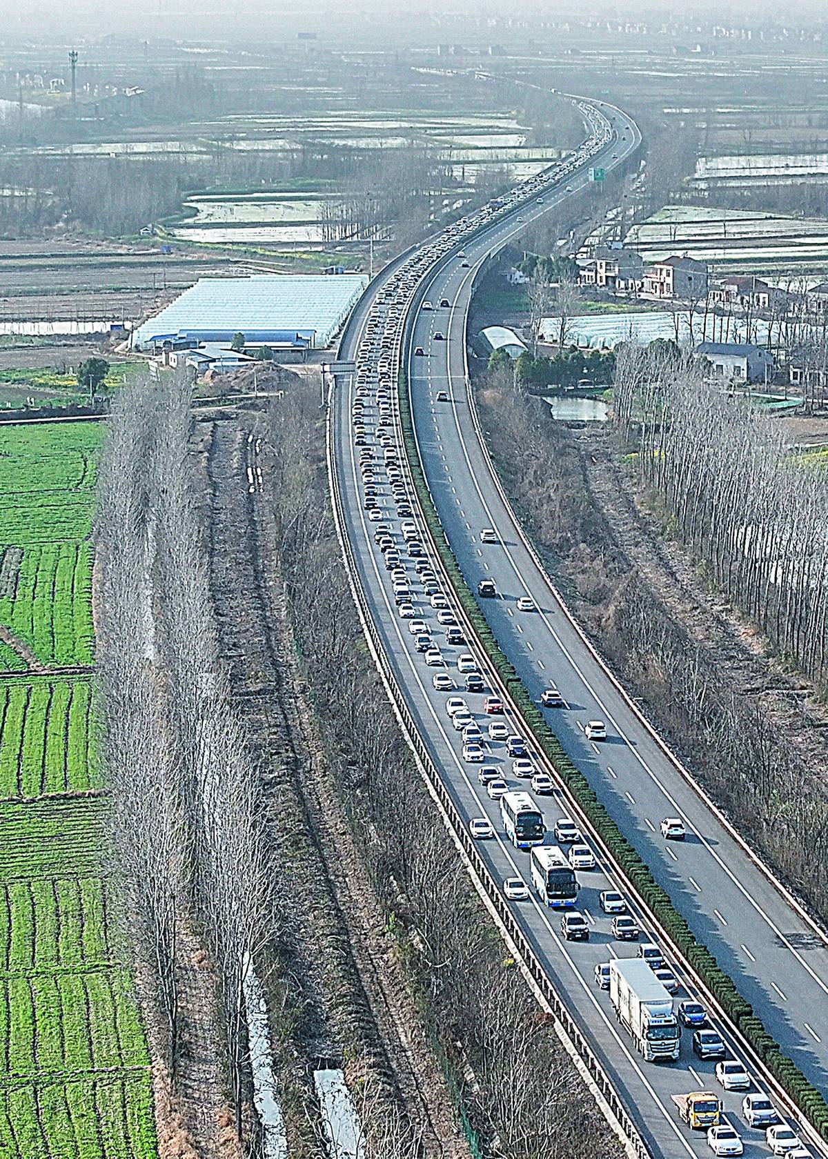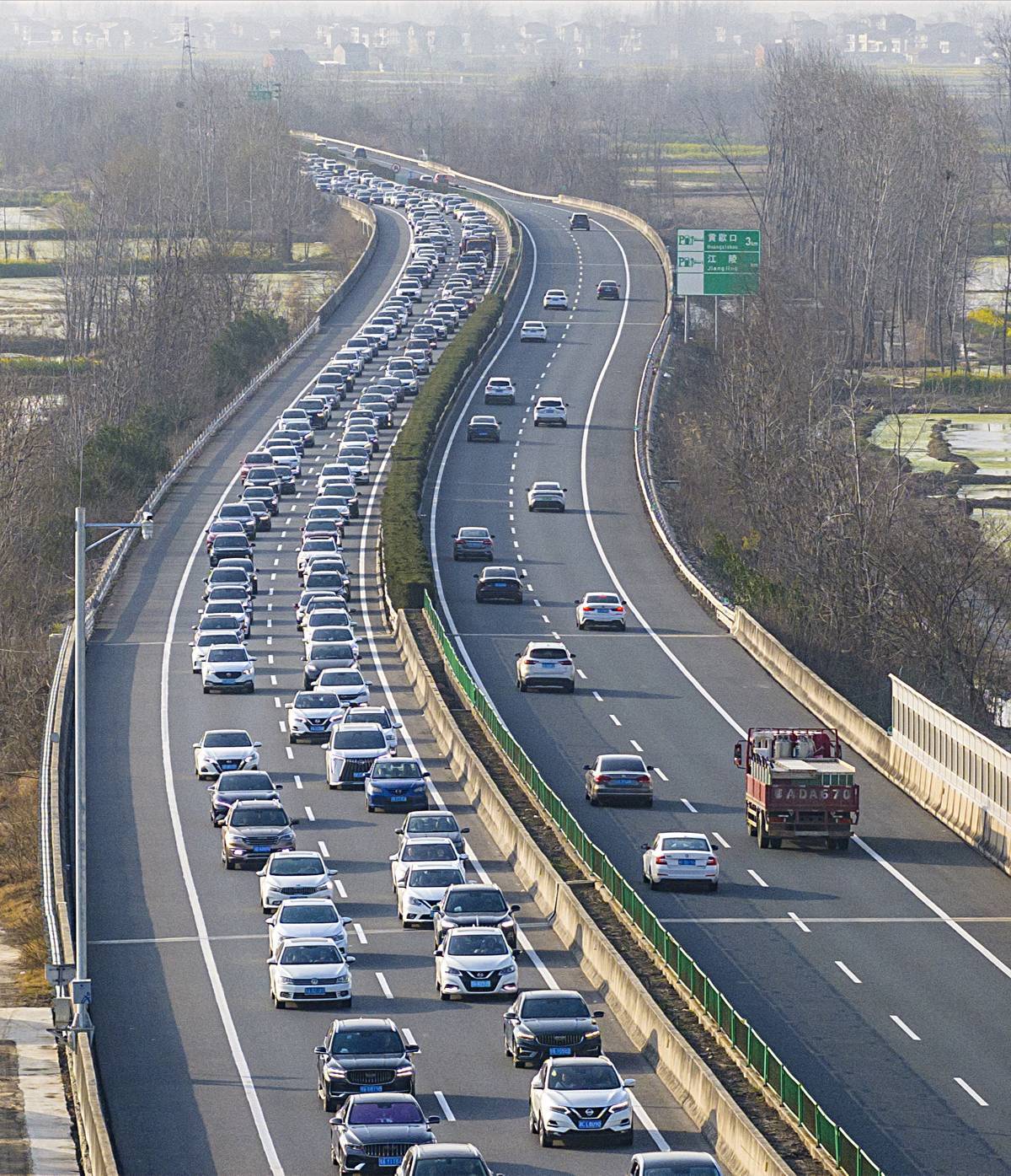 2月22日,大年初六,春运公路返程客流已进入高峰,监江高速江陵往监利方向湖北监利市周老嘴镇路段,车流量大,导致拥堵。