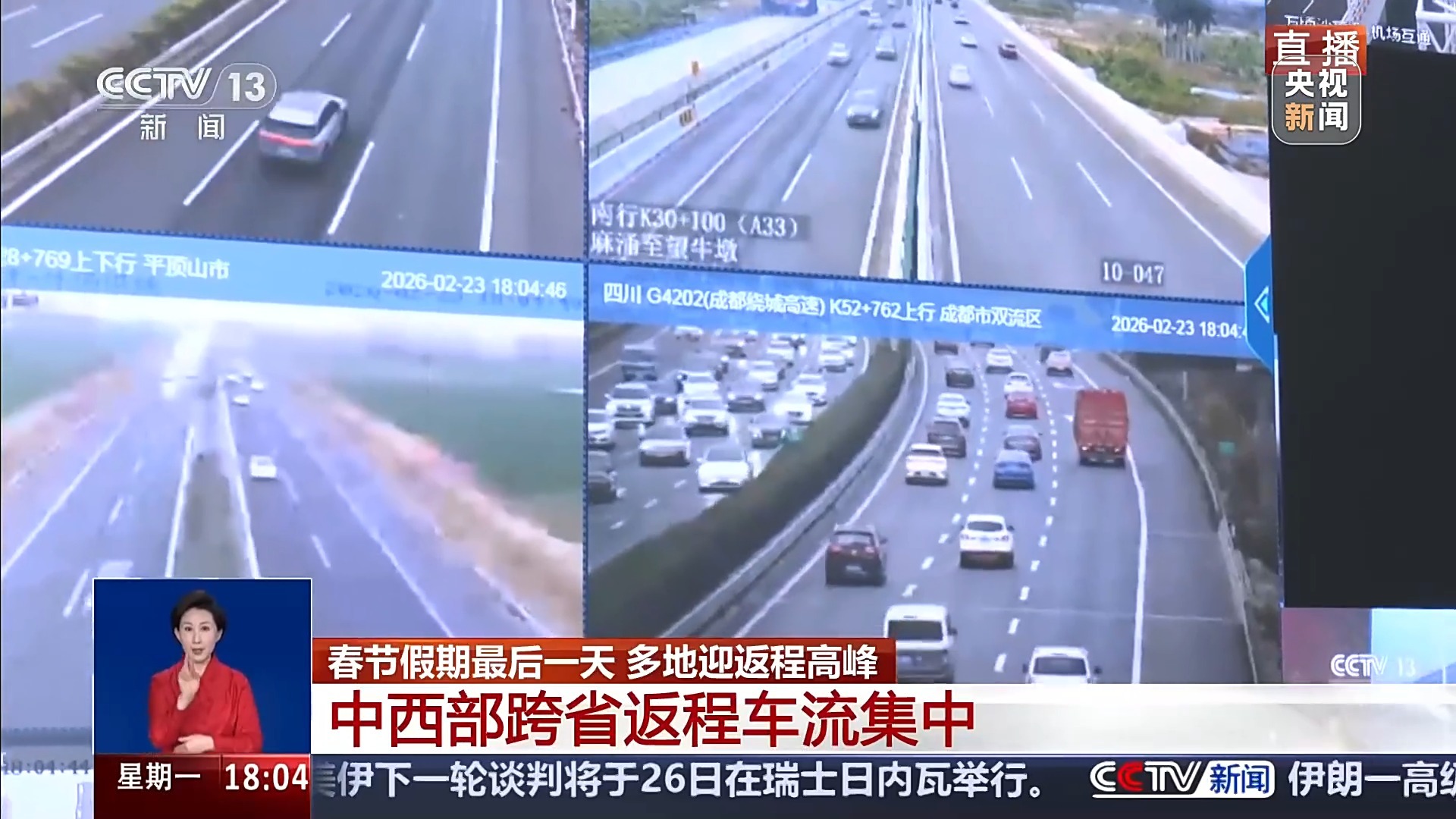 春节假期返程进入收尾关键阶段,根据在路网指挥中心了解到的情况,目前是务工流和探亲流集中返程。今天,全国高速公路车流量预计超6600万辆次。比昨天相对有所下降,通过实时画面,来了解一下重要路段的通行情况。