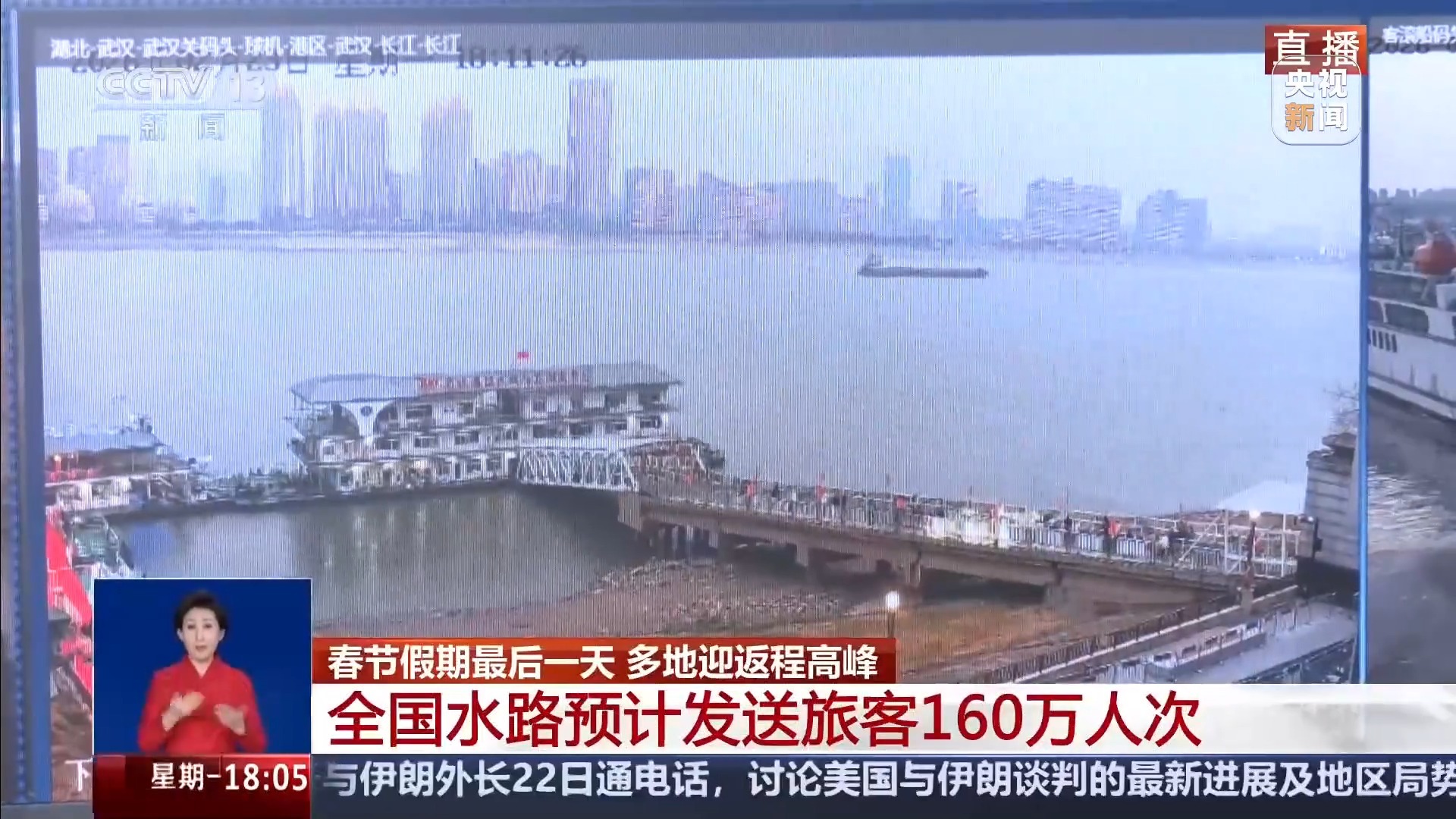 最后来关注水路出行。今天,全国水路预计发送旅客160万人次。昨天受大风影响停航的浙江宁波三江夜游、东钱湖等3条航线已恢复通航。今年春节假期,武汉轮渡日均发船110航次,累计发送旅客约37万人次。再来看一下热门的琼州海峡,记者从海南海事部门获悉,为高效应对返程车客流高峰,每天9点和18点,官方平台将结合天气情况有序放票,有需要的朋友们可以重点关注。