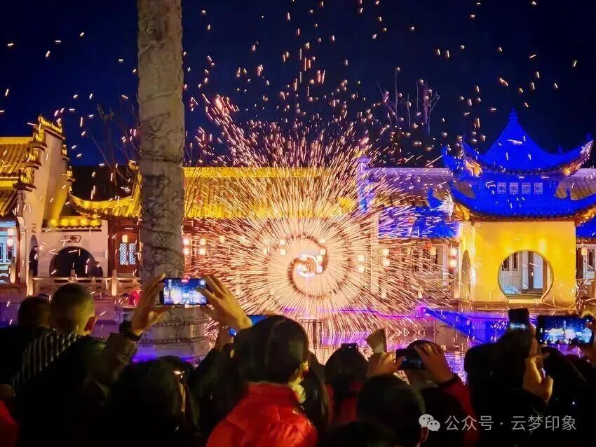 从白天到夜晚,景区热度不减。灯火璀璨处,铁花似诗、烟火如梦,不少游客在朋友圈感慨:年味就在打铁花的火星里、鱼面的热气中、皮影戏的光影下。