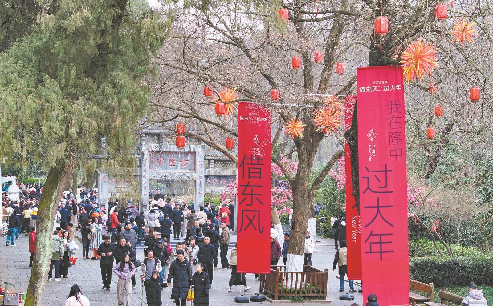 NPC互动更是受到游客追捧。崔州平守牌坊、大乔小乔驻国风营地、孙权关羽立三顾堂广场……游客与三国NPC互动,在沉浸式游园闯关中,感受三国文化。春节假期,古隆中景区累计接待游客超13万人次,单日最高接待游客超3万人次。