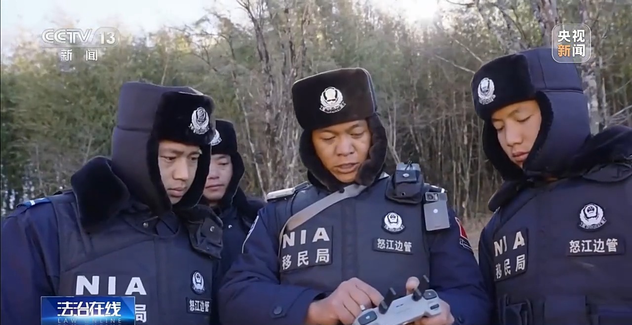 民警和建武操控无人机,对徒步难以抵达的地面盲区开展空中巡查。无人机实时传回山坳内的现场情况,大幅提升了边境巡护的效率。