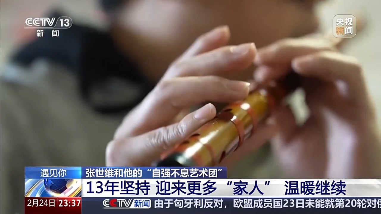 自强不息艺术团乐手 吴翔:我是一名竹笛手和二胡手,他们经常给我起的外号说我是我们乐团的“红花”,他们是我的“绿叶”。我经常都在笑,我说要是这朵“红花”没有了“绿叶”,它一样就不是一朵花。可能是我给他们带来了帮助,他们也给我带来了更多的爱。