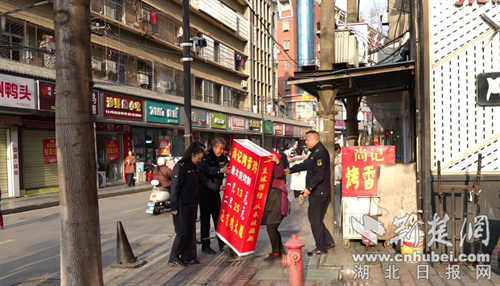 市容管理刚柔并济,助力商户复工。城管执法队员坚持“服务先行、管理跟进”的理念,深入大街小巷,重点对节后商户易出现的店外经营、乱贴乱挂以及占道堆放等违规行为进行耐心劝导和规范。