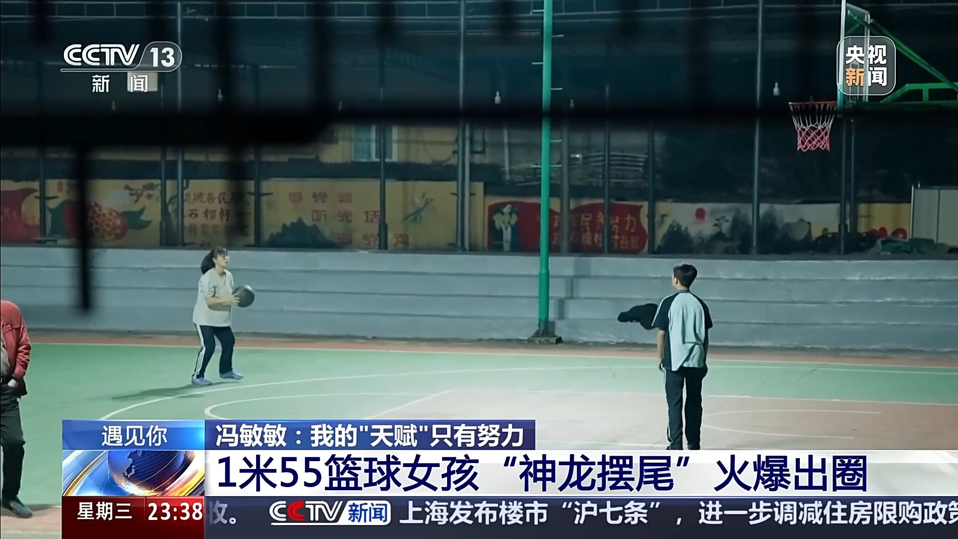 家门口的篮球筐,是冯敏敏的爸爸为了支持女儿的梦想,买来的二手球筐。这个简易球场,陪她度过了很多个清晨和傍晚。