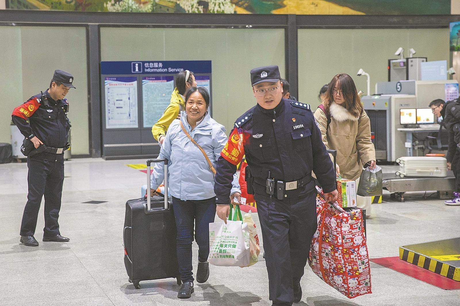 2月23日,襄阳铁路公安处襄阳站派出所民警成立“志愿服务队”,在襄阳火车站为返程旅客提供问询、指引、拎行李等便民服务,并协助维护现场秩序,全力保障返程旅客出行安全、顺畅,以实际行动守护平安归途。