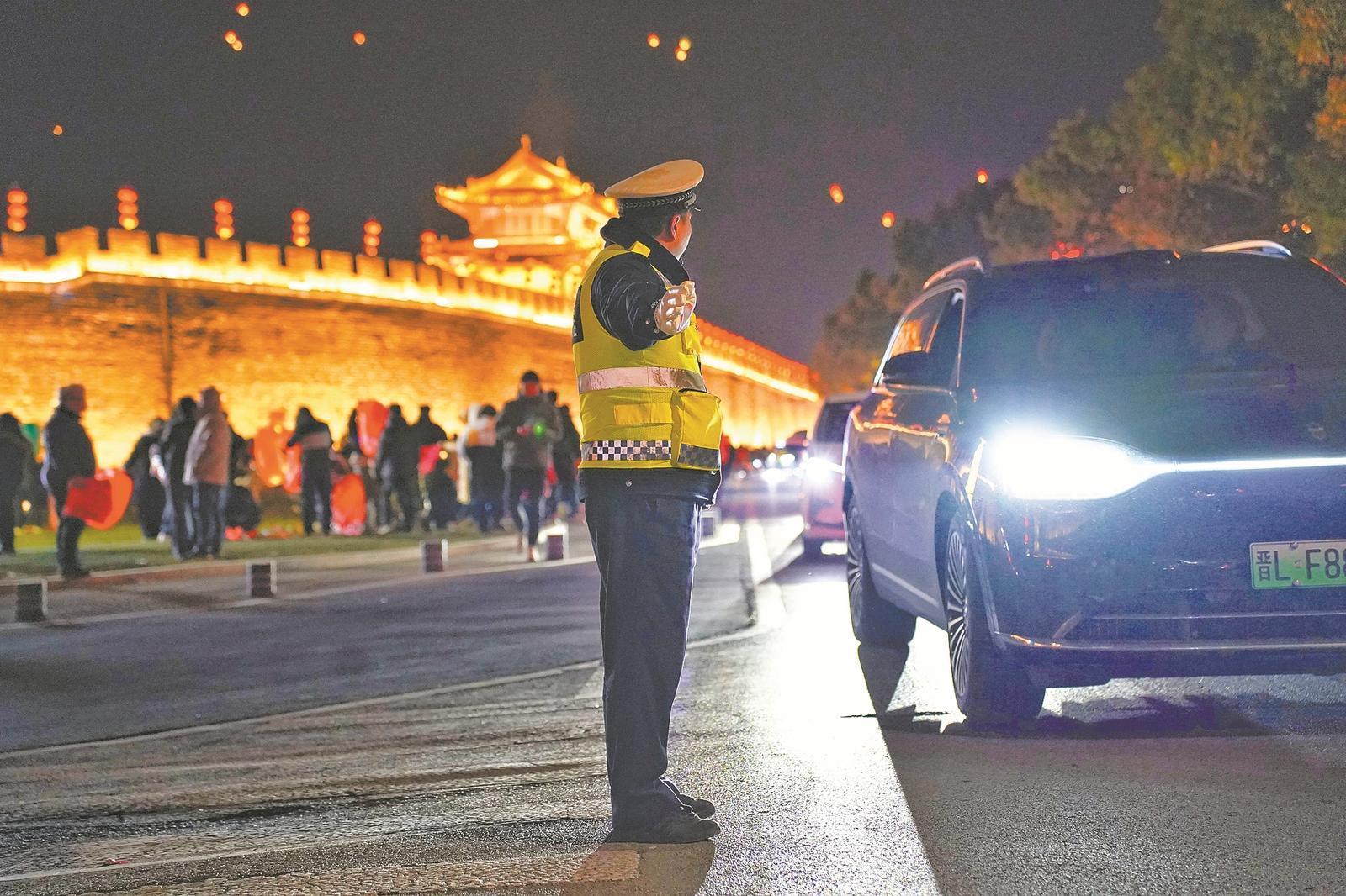 春节期间,襄阳交警在临汉门周边巡逻执勤、服务群众。通讯员 黄胜 摄