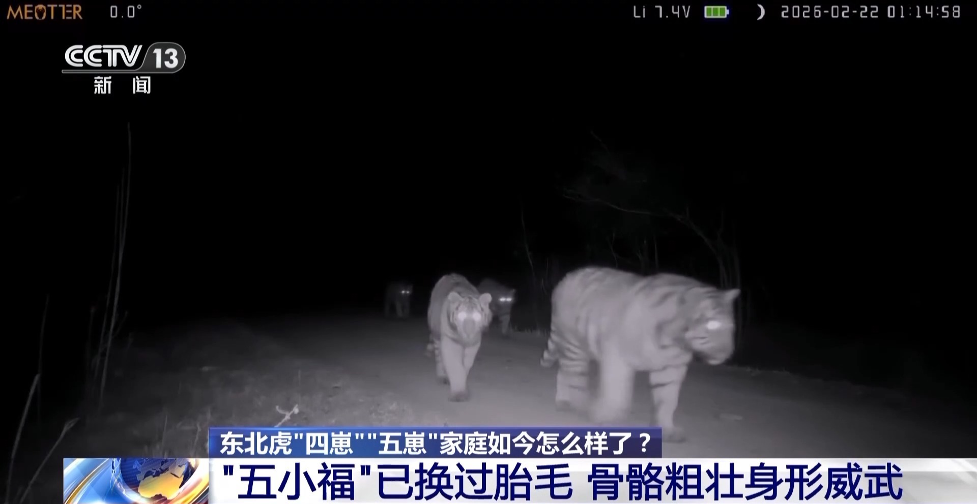 在2月22日最新监测到的视频中,约8个月的“五小福”已经换过胎毛,近景镜头中可见骨骼粗壮,身形威武,已初具“森林之王”的风范。经溯源调查,产下“五小福”的GH005f母虎现在约9岁,有四次繁殖记录。其中一次发生在2023年。在当时由监测系统拍摄到的一组画面中,GH005f母虎带着三只幼崽出行,有一只因仅仅露出上半身,花纹拍摄不够全面而导致其身份确认经历了较大周折。