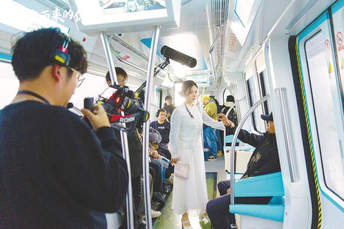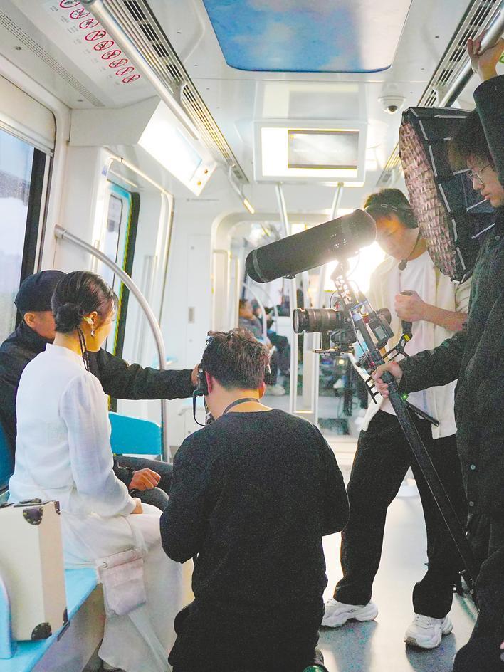 图①②:微短剧剧组正在光谷空轨车厢取景拍摄制作。(武汉东湖高新区宣传部供图)