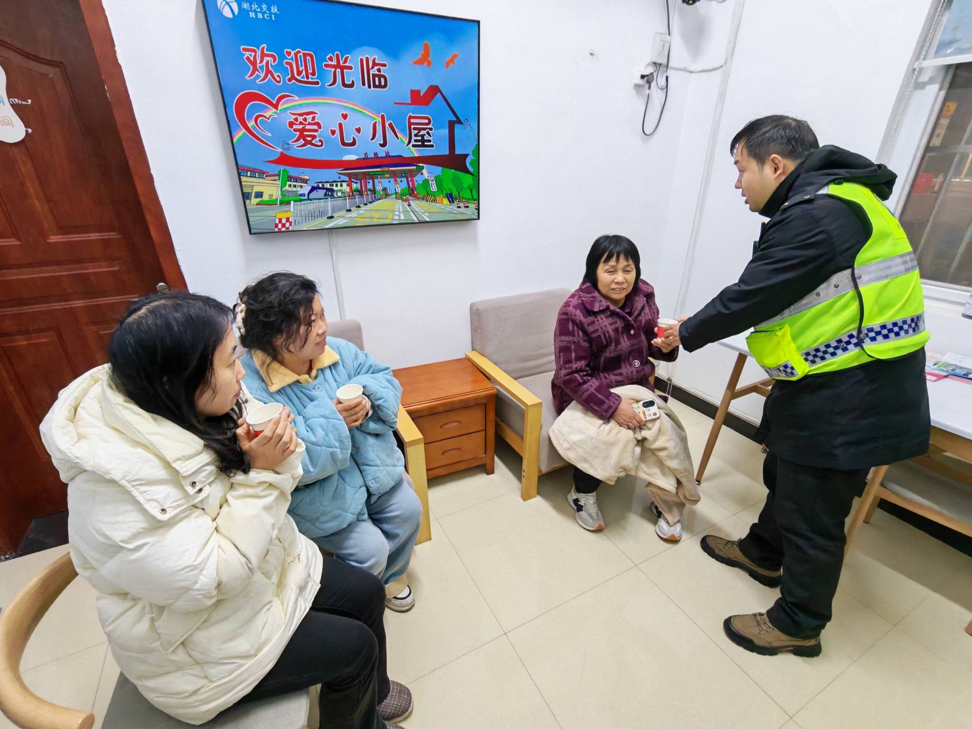“师傅,喝口热茶暖暖身子!”在收费广场,志愿者们为等待司机递上姜茶、热水,在爱心小屋准备好热水、应急药品、维修工具等用品,为司乘人员提供更加贴心服务。