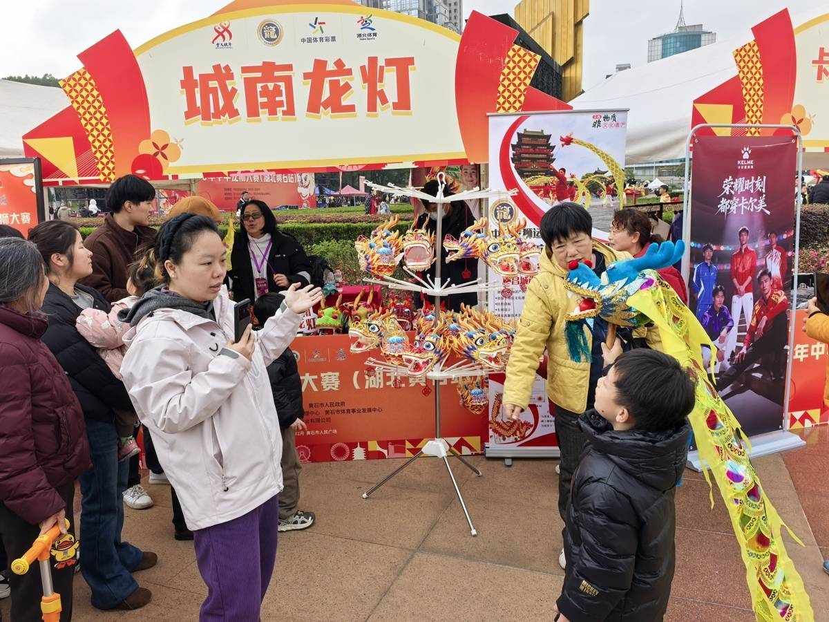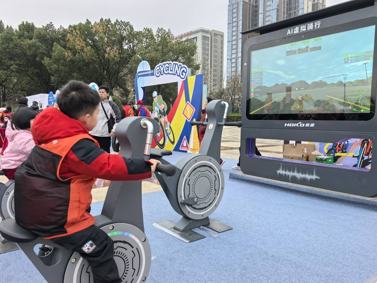 “来来来,我挑战一把!”壮硕的田先生在“挑战黄石腕力王”扳手腕擂台上连胜数人,众人齐声喝彩;在智慧骑行区,11岁的冯俊华一边快速骑行,一边紧盯眼前的大屏,上面不断闪烁着自己的速度、心率、热量消耗等数据;灯谜区则围满了老老少少,不断有猜中者揭榜兑奖……人民广场会聚而来的近万名市民,不仅可以参加热闹非凡的体育庙会,还能品美食、看非遗、体验休闲运动、观赏龙狮盛宴。