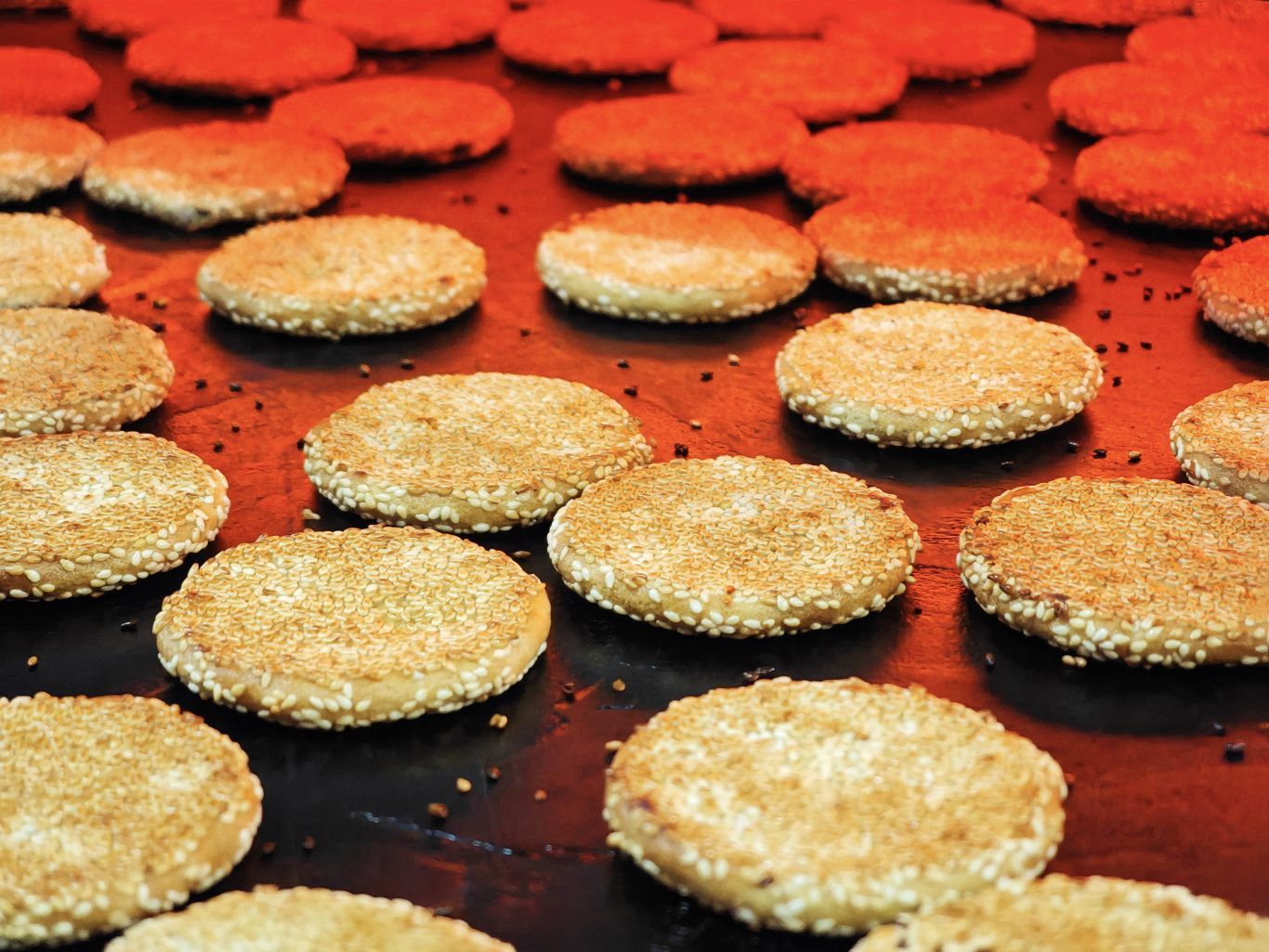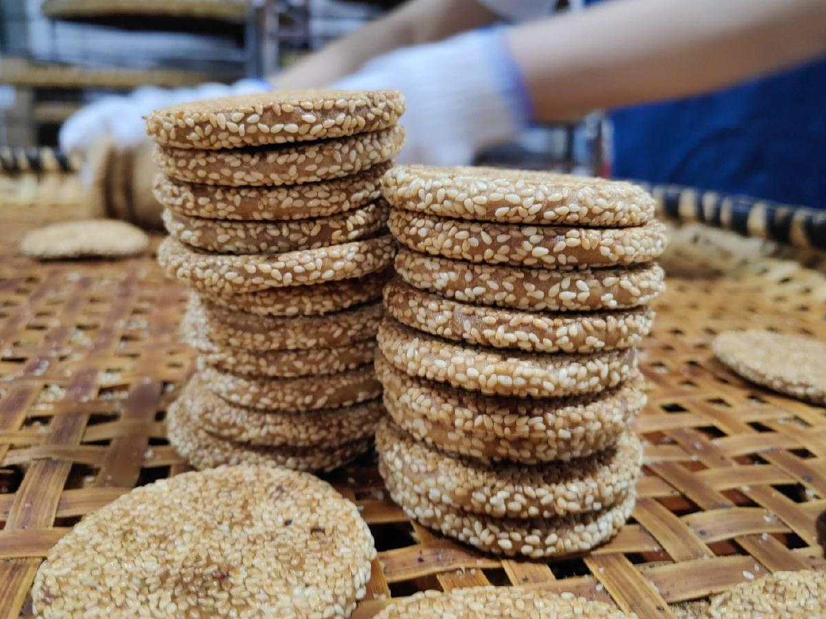 “我们的港饼生坯厚度大概5-6毫米,直径不超过6.5厘米。经过烘烤出炉的港饼,厚度和传统的相比大概缩减了三分之一。”偌大的簸箕逆时针来回摇晃,里面的近百个港饼生坯在晃动间,均匀地裹满白芝麻,益朵港饼创始人程宏兵俯身凑上前查看生坯厚度。