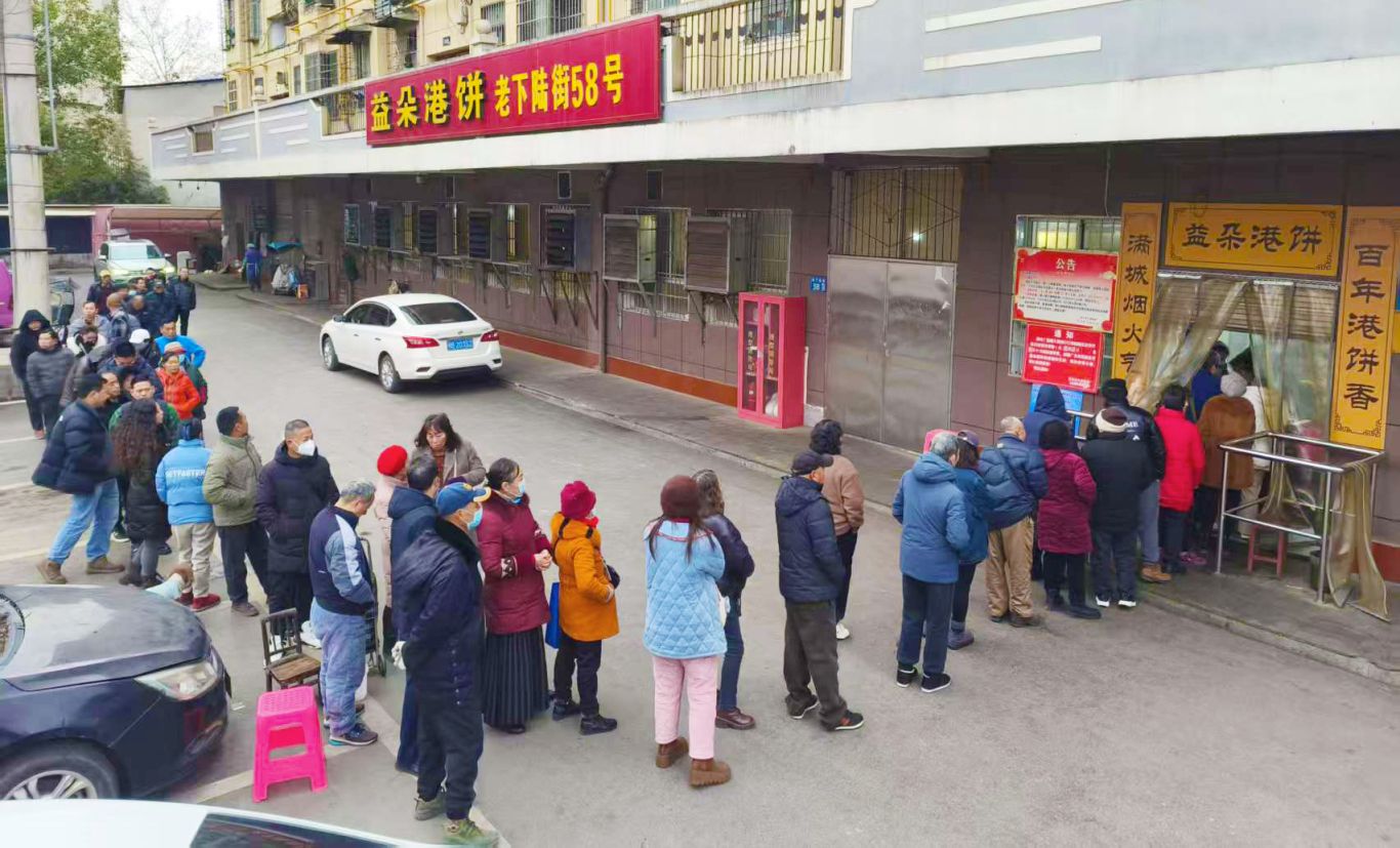 “6点半过来的,我们过年要出省,要买了带到外省去,因为这个是湖北黄石的特产。”曾爹爹的家人以前住在黄石,十多年来的春节,他总会骑着自行车来排队购买益朵港饼,给远方的家人捎去熟悉的家乡味。