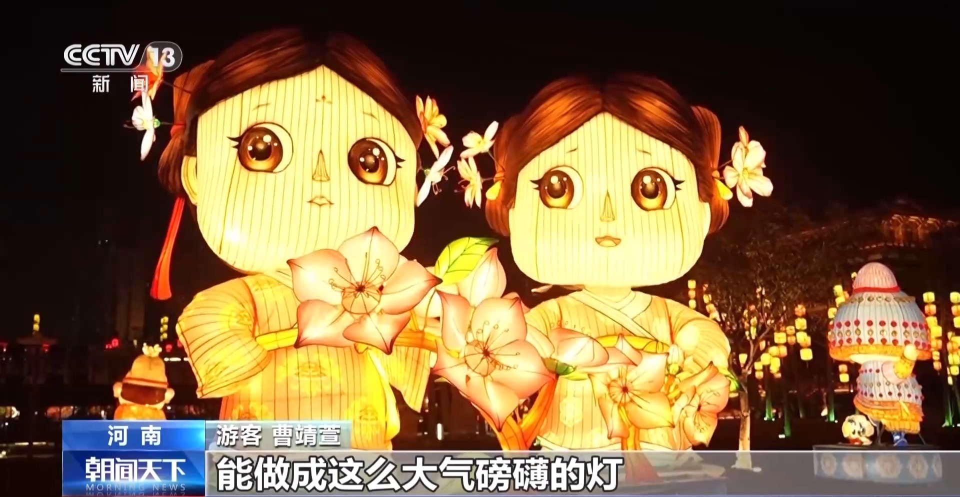 走进隋唐洛阳城,记者发现,今年的元宵灯会不太一样,这里没有千篇一律的灯笼,取而代之的是造型各异、错落有致的创意灯组:洛阳博物馆的镇馆之宝“彩绘陶牵手女俑”被巧妙点亮,游客漫步其中,像是穿越时空,感受到恢宏的盛唐气象。