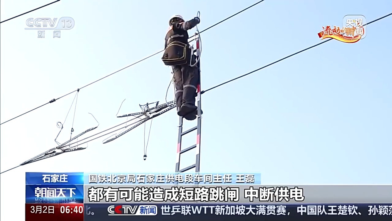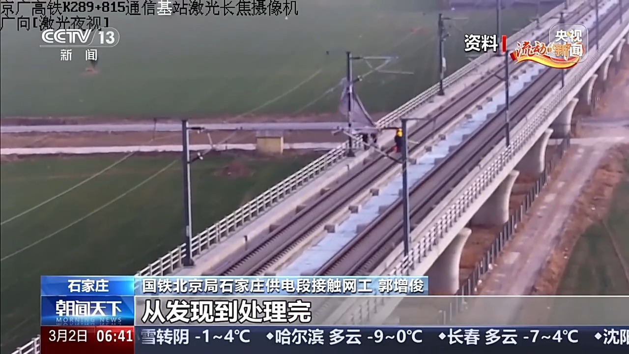 国铁北京局石家庄高铁车间主任 王磊:我们还要时刻留意线路周边有没有轻飘物。一块塑料布、一个塑料袋,一旦被大风刮到高压接触网上,也可能造成短路跳闸、供电中断。