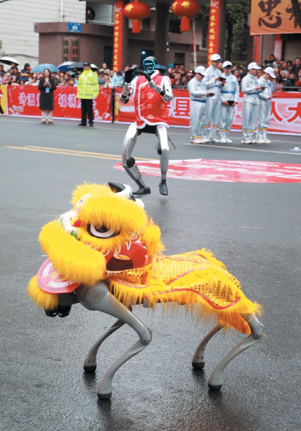 房县教育局代表队带来的《智趣伙伴总动员》表演,一登场就备受关注。2个智能机器人、4只身着醒狮服的机器狗,在房县实验小学小演员的精准操控下,灵活地完成拜年、转圈、跳舞等动作,憨态可掬的模样引得观众纷纷拿出手机拍照,掌声、欢呼声此起彼伏。