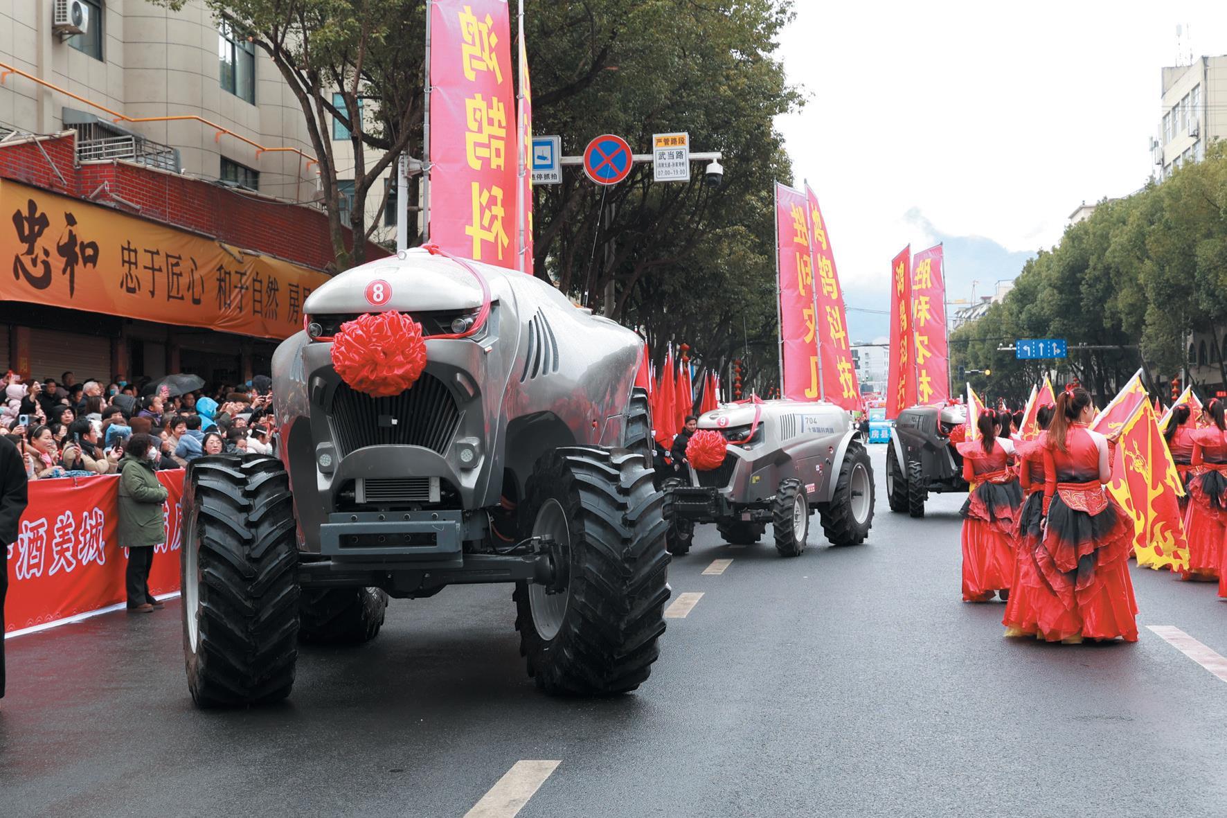 除了萌趣的智能表演,巡游队伍中还有不少科技亮点:无人驾驶智能农机缓缓前行,尽显乡村产业升级的硬核实力;无人投递车穿梭其间,用科技赋能城市便民服务;3D打印的十二生肖、八角楼等房县特色建筑和新春对联,激光切割机打造的骏马造型,件件精致生动,让现场观众直观感受科技的魅力。