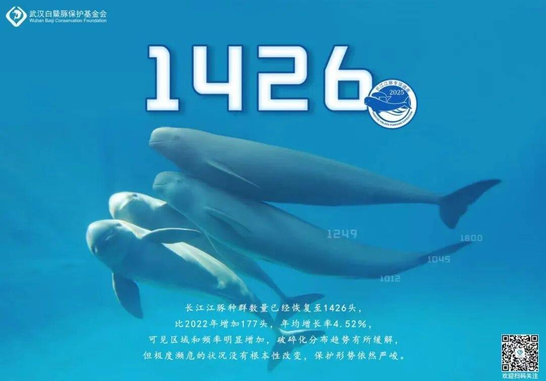 而最新数据为这份守护写下亮眼注脚。2026年1月农业农村部公布,长江江豚种群数量恢复至1426头,较2022年增加177头,年均增长率4.52%,分布破碎化趋势得到缓解,实现“稳中有升”的历史性逆转。