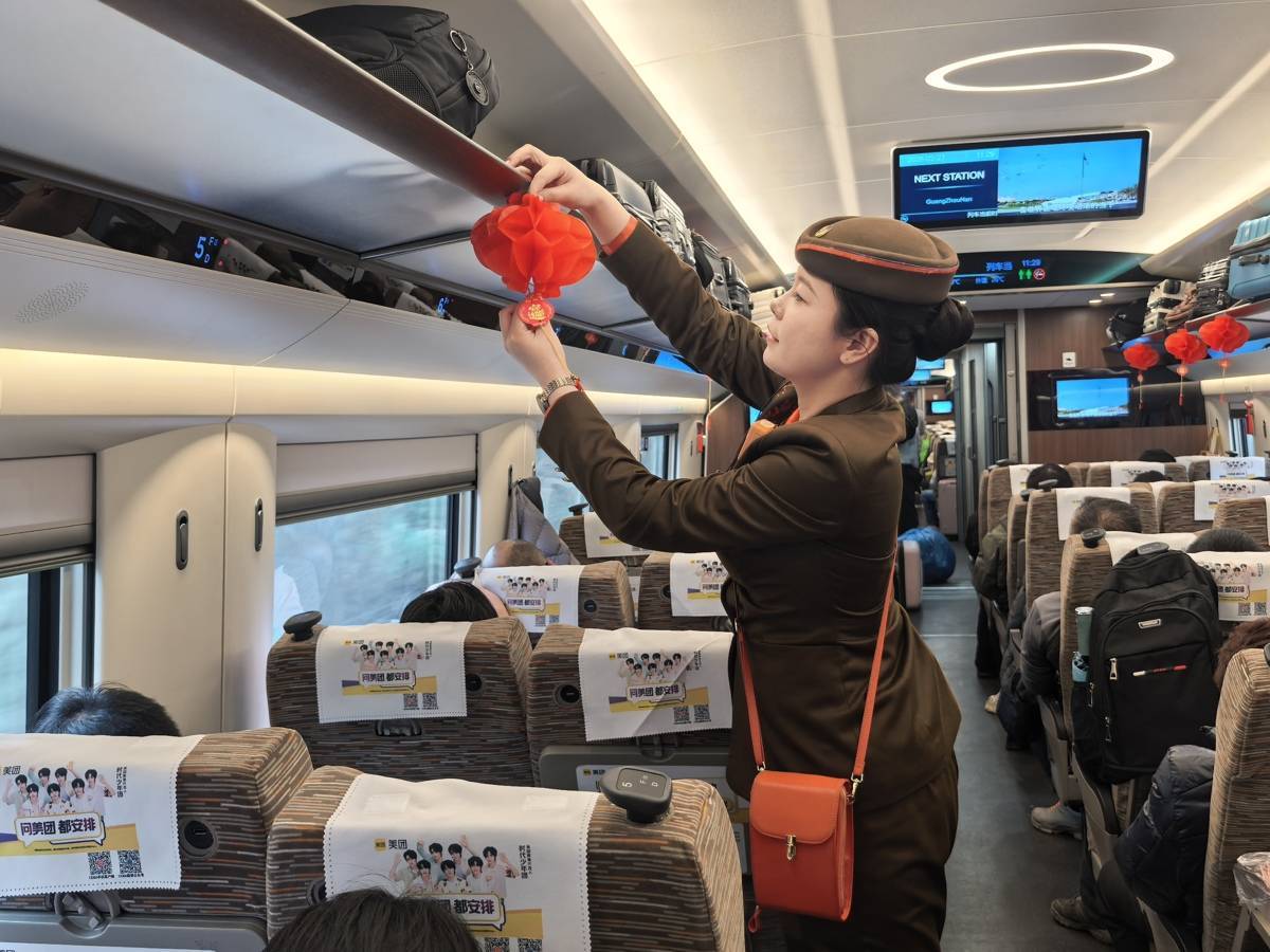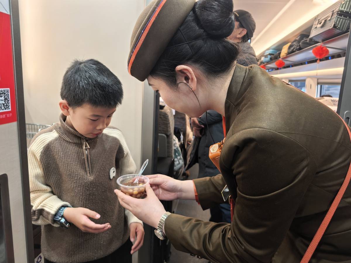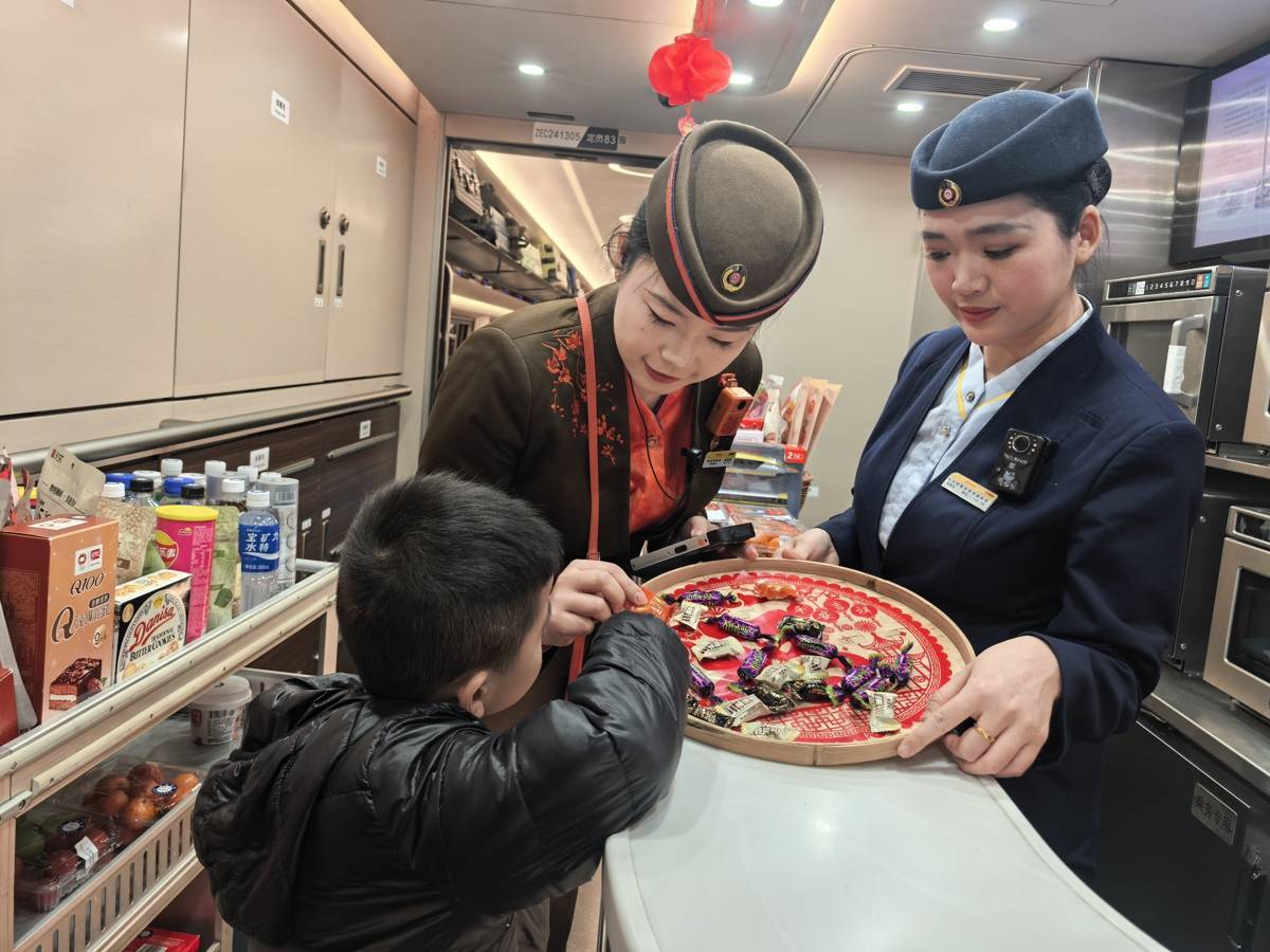 3月2日,正值元宵节前夕,由武汉客运段南线动车组车间担当值乘的G391次列车车厢内张灯结彩、暖意融融,列车乘务组精心策划“情暖高铁 喜乐元宵”主题庆祝活动。列车员们将传统民俗文化与暖心客运服务深度融合,与南来北往的旅客共庆佳节、共话团圆,为春日旅途增添了浓浓温情与别样年味。活动现场温馨热烈,欢声笑语充盈整个车厢。旅客们纷纷驻足参与互动,手持灯笼、福字与工作人员合影留念,用镜头定格高铁上的温馨瞬间。小朋友们捧着糖果、提着小灯笼欢呼雀跃,旅客们品尝着汤圆连连夸赞。车厢内其乐融融,处处洋溢着团圆与幸福的气息,不少旅客直言这是一次既难忘又暖心的旅途元宵体验。(湖北日报通讯员 周赟玥 任莹娇 摄)