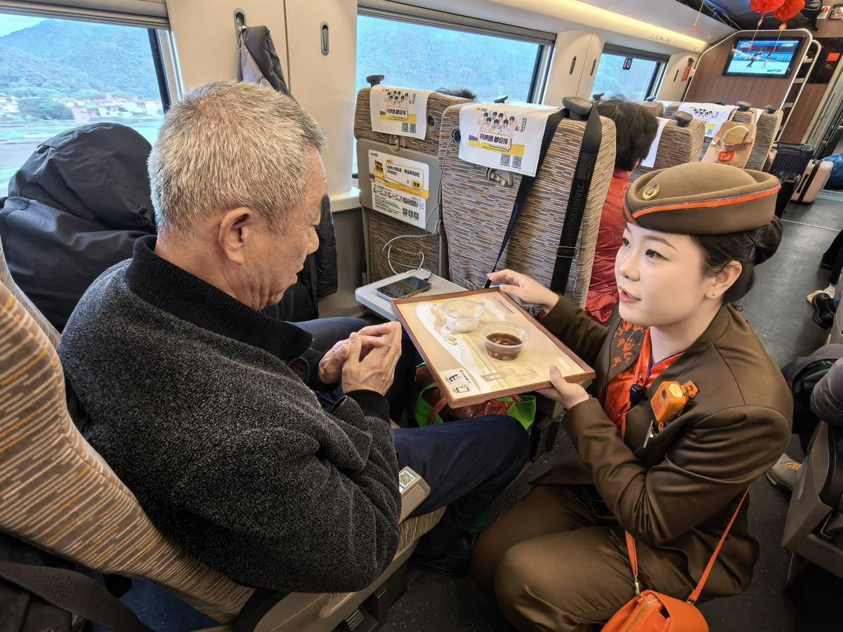列车员张蓝澜与餐服长程艳提前备好热气腾腾的汤圆、香甜缤纷的糖果。