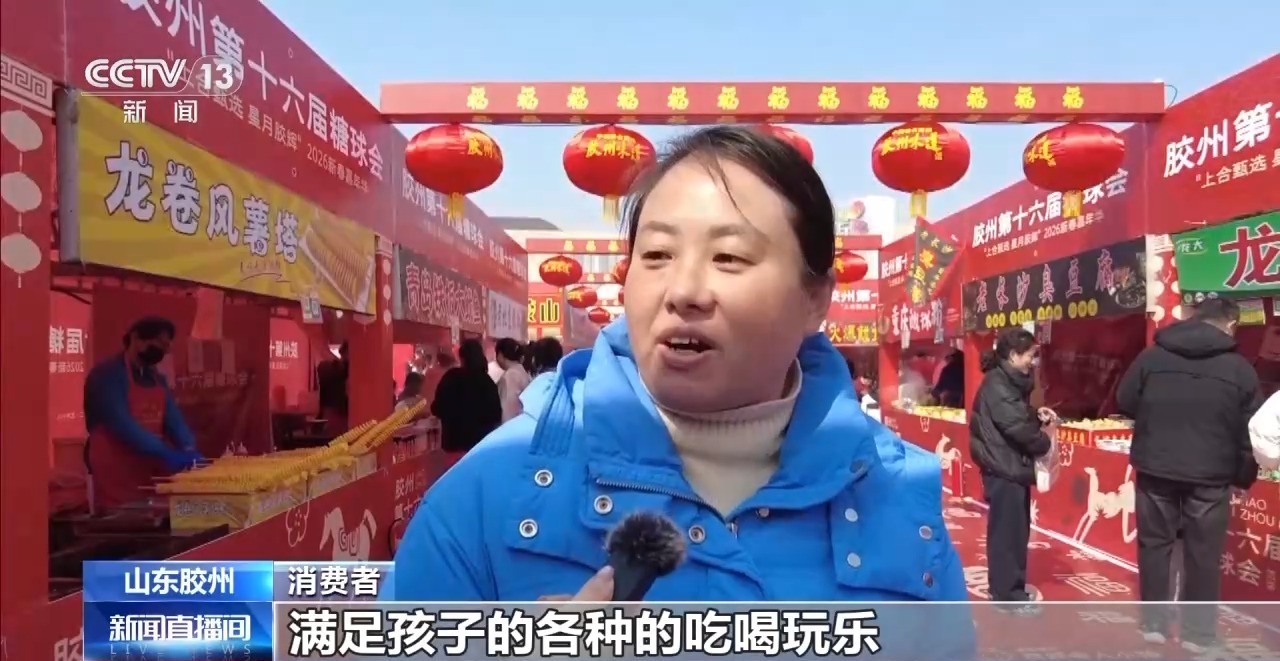 在山东青岛胶州市的新春嘉年华活动现场,人头攒动,气氛热烈。特色美食区人气颇高,除了地道的胶州糖球,来自全国各地的特色小吃也悉数登场,香气扑鼻。现场还设置了民俗特产、互动娱乐等主题区域,大家在逛、吃、玩、乐中欢度元宵节。