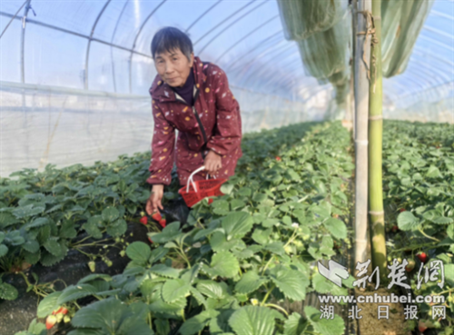 荆楚网(湖北日报网)讯(通讯员 腾腾 郑可)3月3日,在京山市永兴街道潘岭村“草莓园”种植基地,一颗颗草莓莹润香甜、颜色透亮,令人垂涎欲滴,数名游客携手亲朋好友一边采摘品尝新鲜草莓,一边打卡拍照。