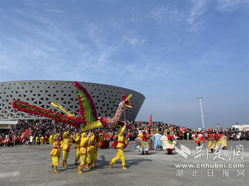 荆楚网(湖北日报网)讯(通讯员 周勇 汪龙 时榴)舞龙队追逐绣球,腾跃翻滚,气势如虹;锣鼓队脚步生风,铿锵击鼓,声震云霄;秧歌队彩扇翻飞,舞步轻盈,扭出浓浓喜庆……
