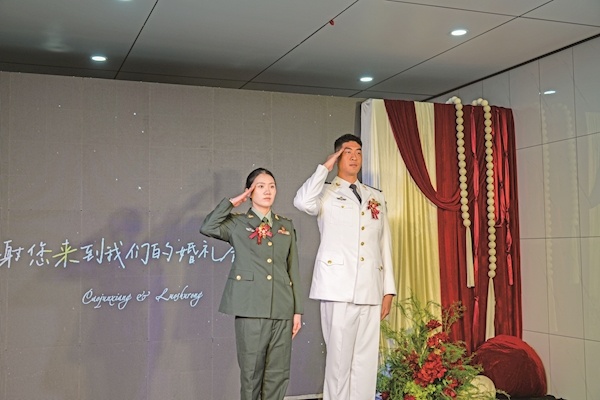 新郎曹骏翔是海军陆战队某旅二级上士,新娘罗书荣是联勤保障部队第926医院检验技师,去年,她还作为联勤保障部队方队队员,光荣参加九三阅兵,用青春践行军人使命。这场本该在去年“五一”举办的婚礼,因一人参加阅兵集训、一人坚守部队岗位,一再推迟,最终在马年元宵这个寓意圆满的日子,迎来最美的绽放。