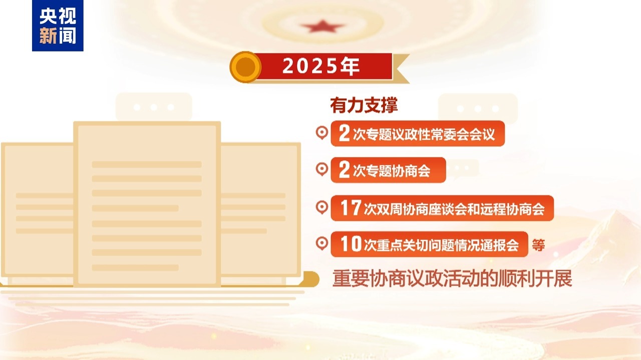 以高质量调研助力高质量发展。2025年,全国政协围绕年度协商计划组织开展66项专题调研,有力支撑2次专题议政性常委会会议、2次专题协商会、17次双周协商座谈会和远程协商会、10次重点关切问题情况通报会等重要协商议政活动的顺利开展,为高质量建言夯实基础。 提案是政协委员履职的重要载体。一年以来,2000多名政协委员勇于担当、履职尽责,提交提案5900多件,其中立案5000多件。提案的部分意见建议被吸纳到有关政策文件中,为科学民主决策发挥了积极作用。