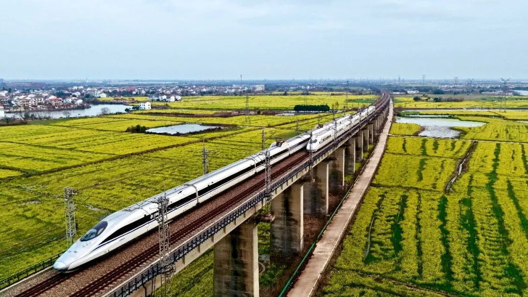 2月27日,江西南昌县,高铁列车从油菜花田边驶过。王超摄