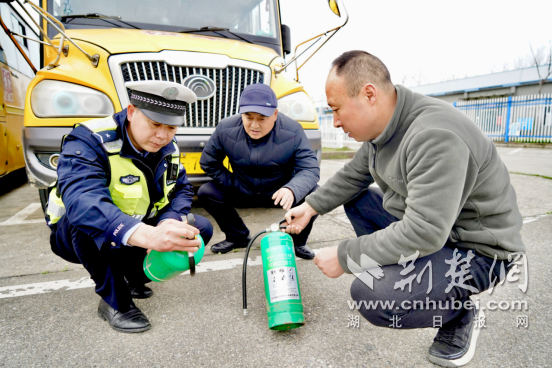 交警检查校车灭火器。通讯员 供图