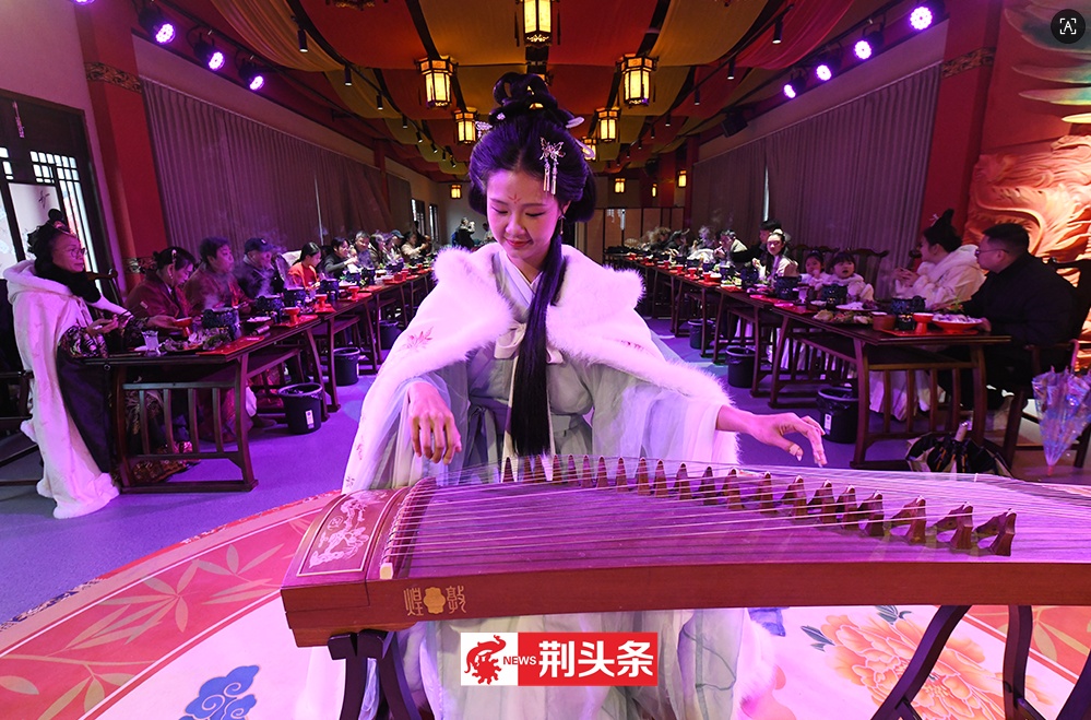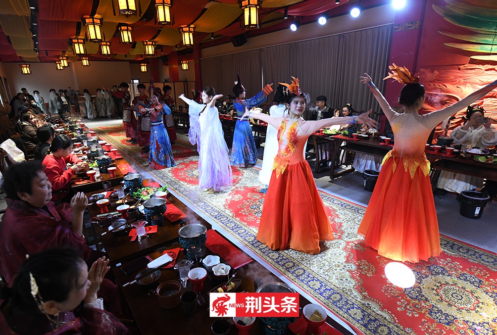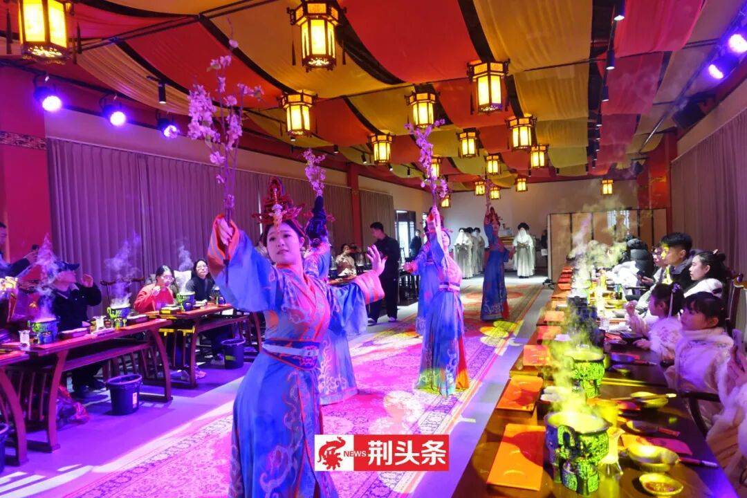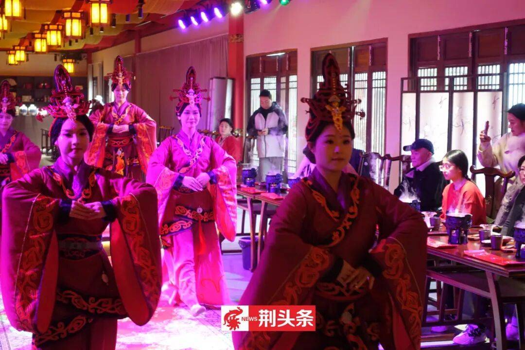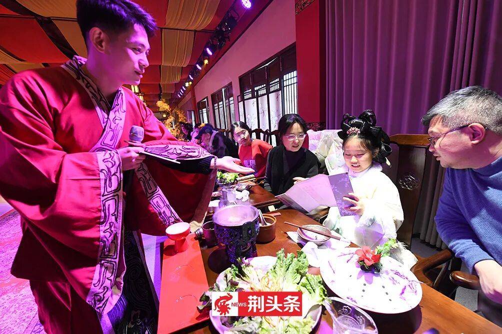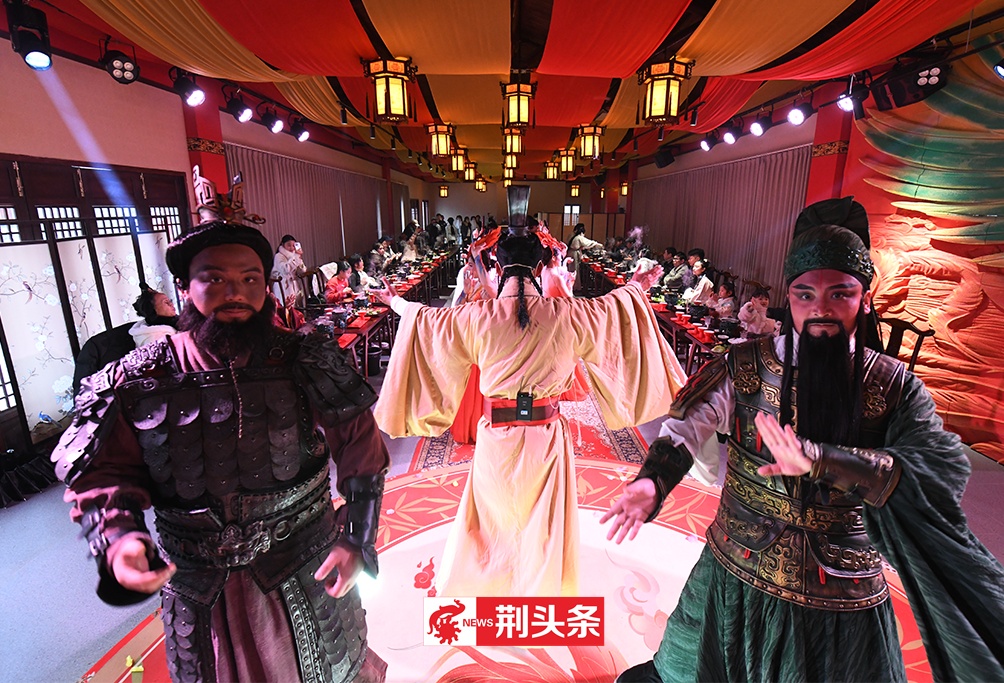 元宵佳节,荆州古城北门片区文旅热度持续攀升,傍晚六点,三义街率先点燃节日热情。备受好评的沉浸式餐秀《三国宴》火热开宴,古色古香的建筑在灯笼映照下更显韵味。食客们围坐于仿古案几前,除了能够品尝洪湖藕汤、荆襄烤乳猪、荆楚非遗米糕等地道风味,还能与演员沉浸式互动,感受三国文化的独特魅力。