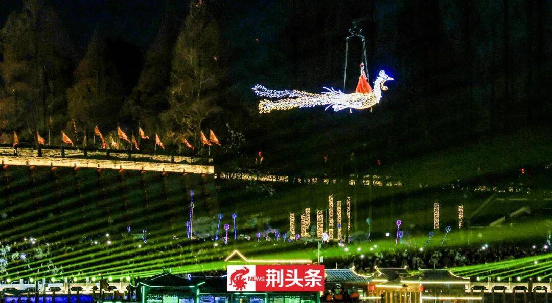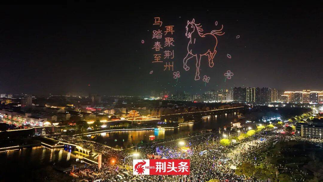 从嫩芽破土到繁花似锦,无人机演绎四季流转,寓意万物复苏;演出尾声,点点光影化作错落悬浮的孔明灯,一匹骏马踏花而来,“马踏春至 再聚荆州”的字样点亮夜空,寄托美好祈愿。