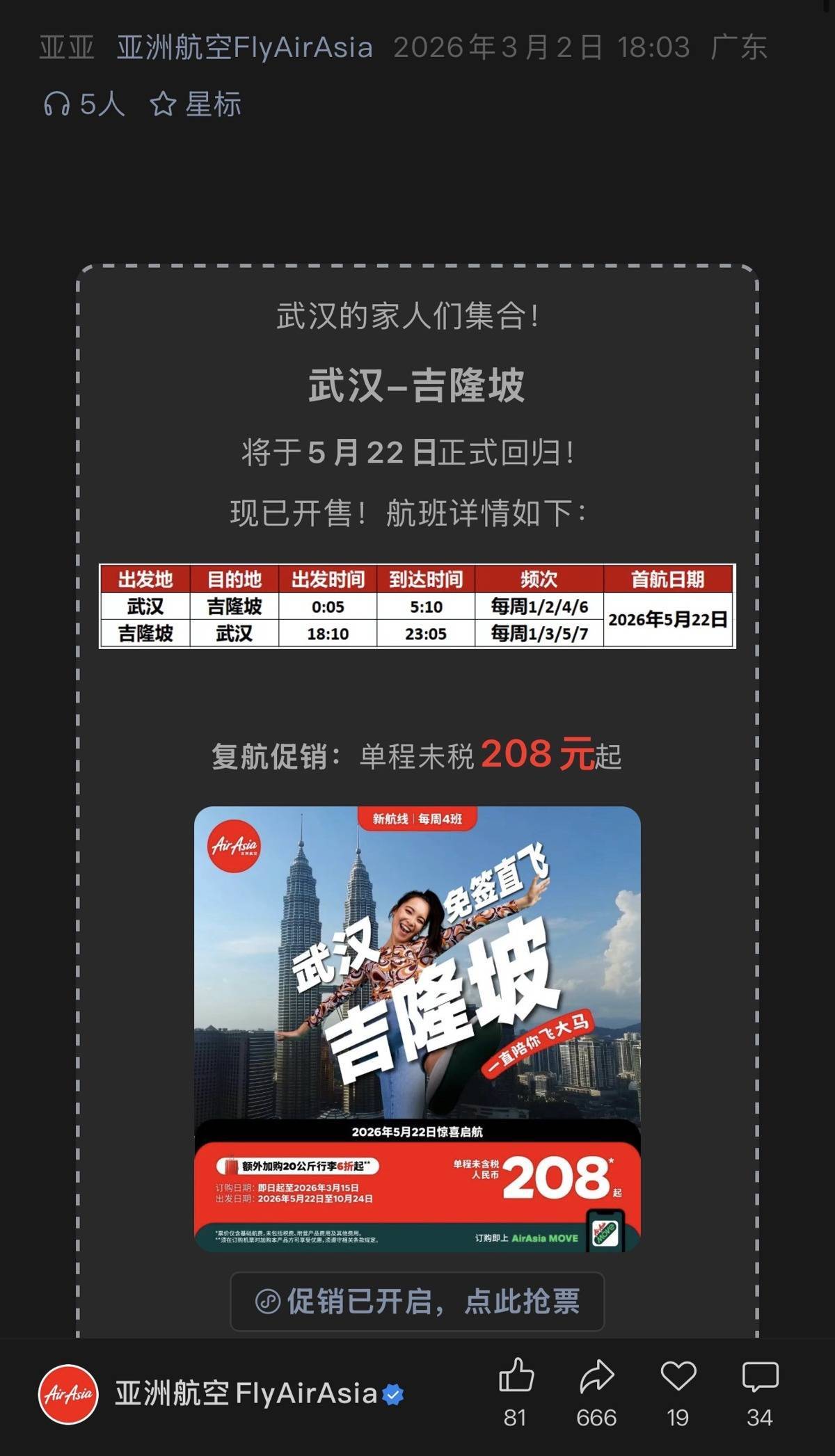 湖北日报讯(记者李源)3月2日,亚洲航空官宣,由该航司执飞的武汉至马来西亚吉隆坡航线将于5月22日复航。单程不含税票价(无行李额)仅为208元起。