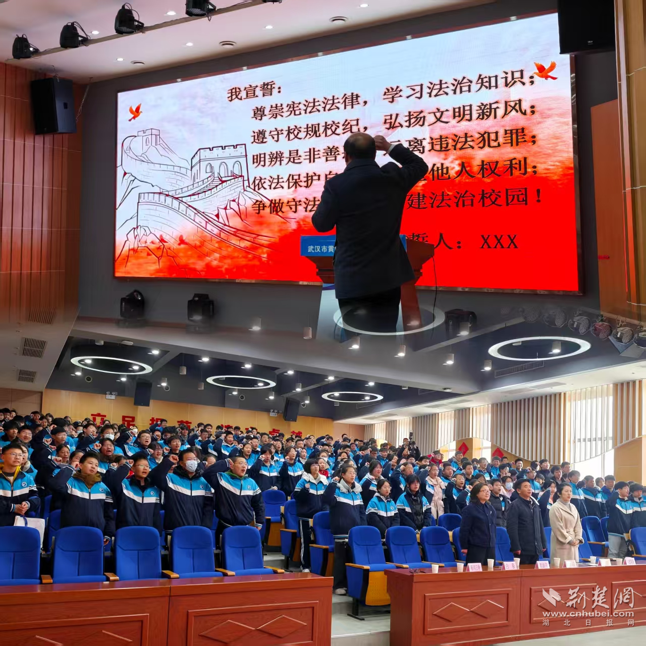 “我宣誓:尊崇宪法法律,学习法治知识;遵守校规校纪,弘扬文明新风……”初心如磐,誓言铿锵。活动尾声,在黄陂区前川三中校长的带领下,全体师生高举右拳、庄严宣誓。铿锵有力的誓言回荡在校园上空,既是对法律尊严的敬畏,也是自觉践行法律的承诺,进一步厚植了全体师生的法治信仰。